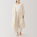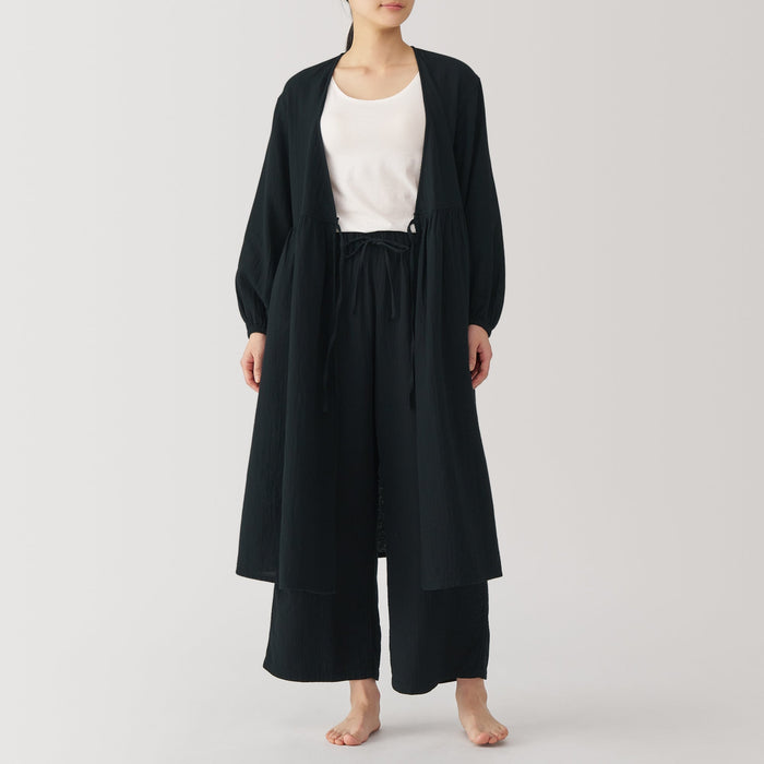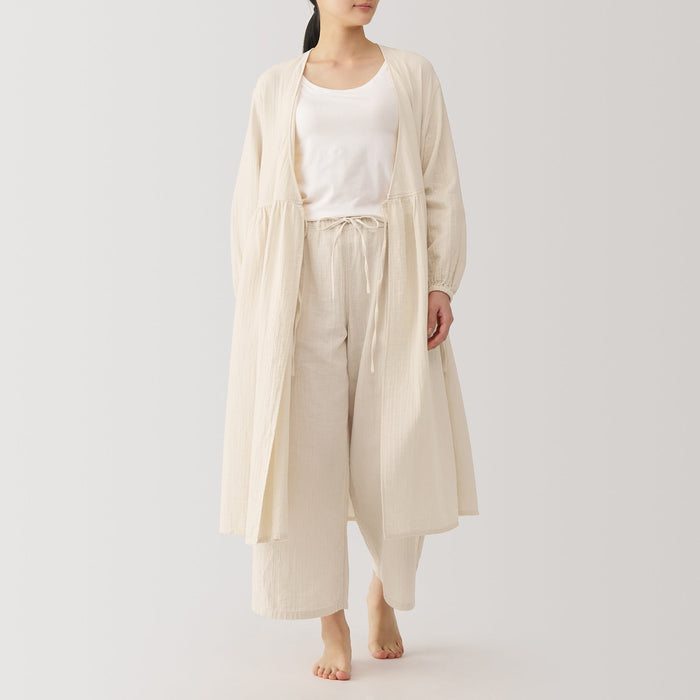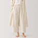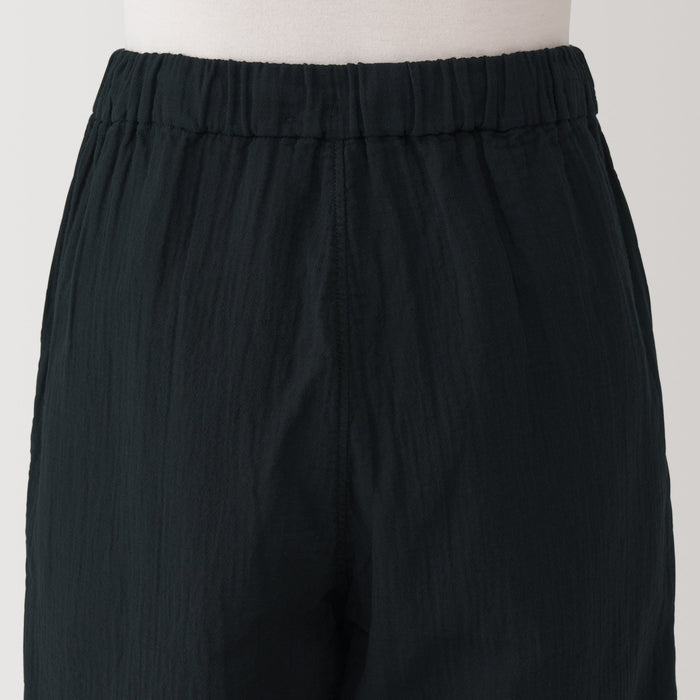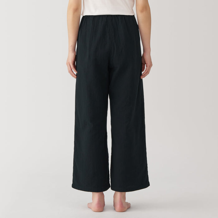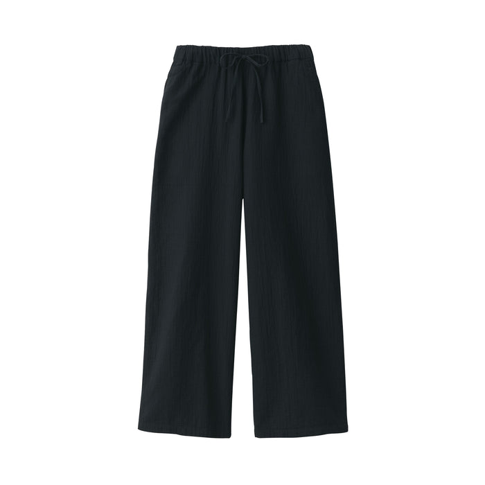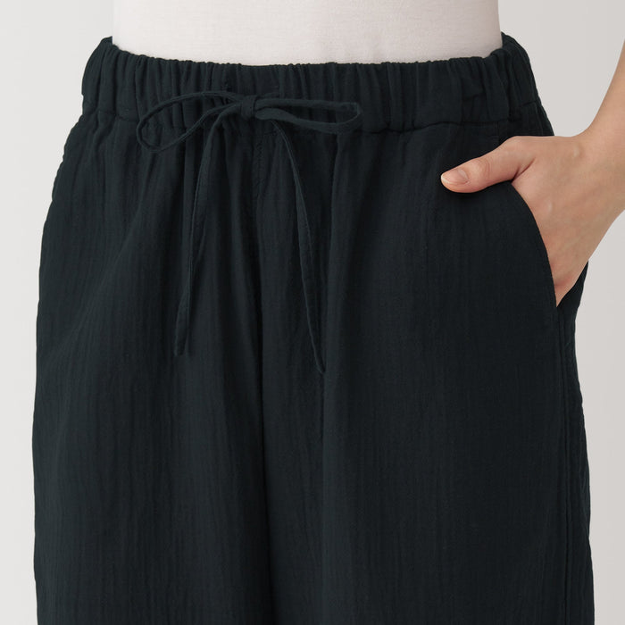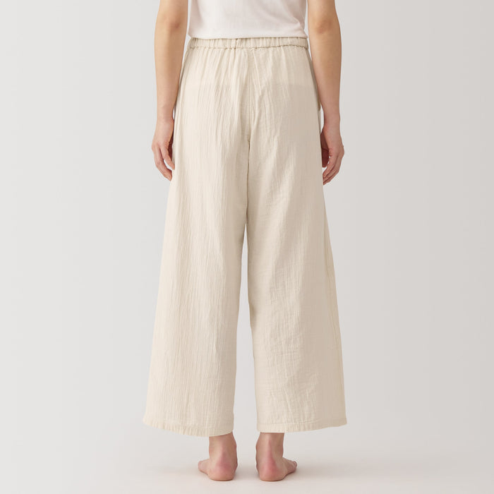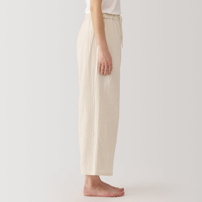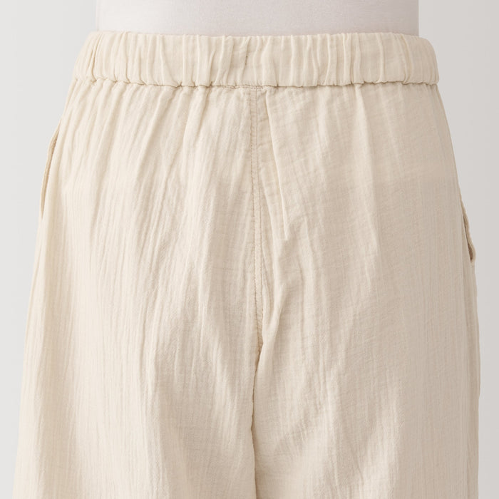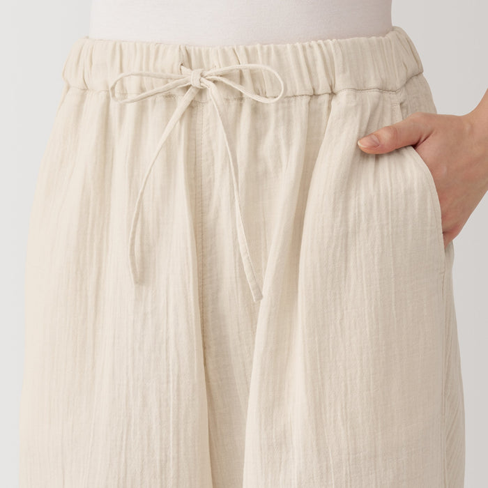Relax comfortably in these wide pants made using a light and breathable double-layered gauze, with a soft, fluffy crinkle texture. The texture allows the air layer between the outside and skin to separate easily. The waist is adjustable with a string. The hem is slightly wide, giving it a relaxed yet stylish silhouette. Made with organic cotton.