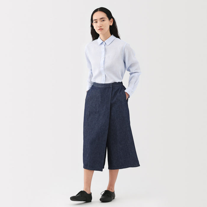 Enjoy all-day comfort in these wraparound dress trousers, made with a soft organic cotton and hemp material. This design looks like a dress from the front, with all the practicality and comfort of trousers.