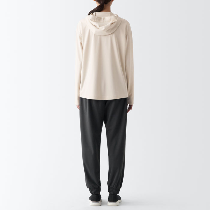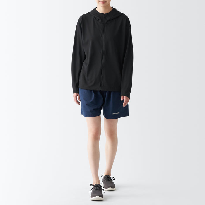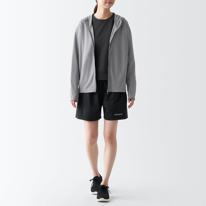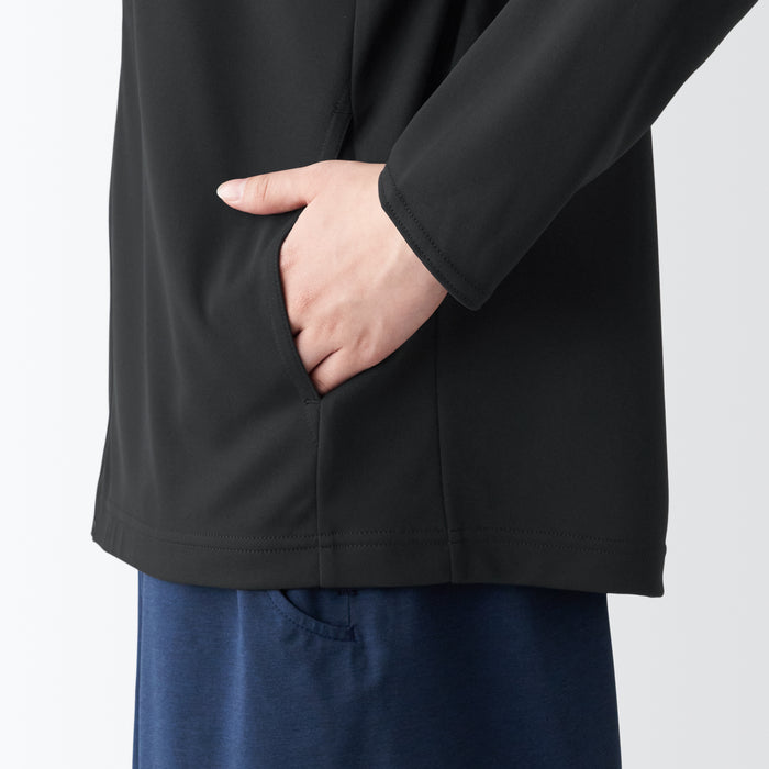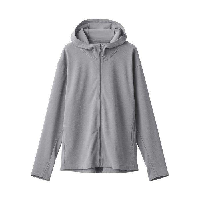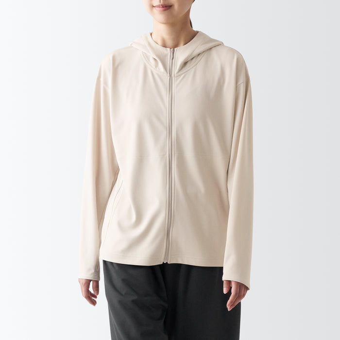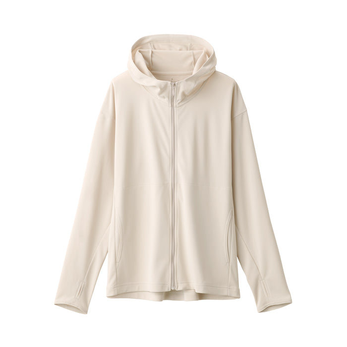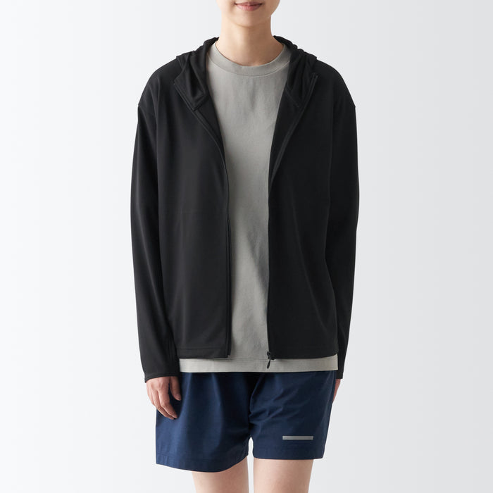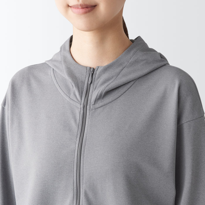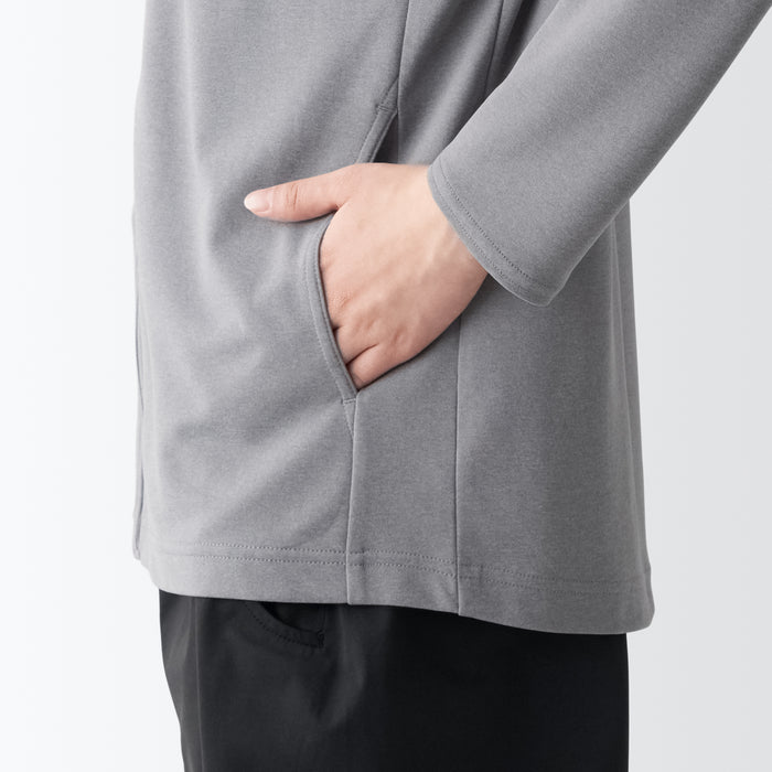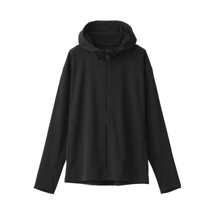 A zip-up hoody using a stretchy fabric that keeps its shape. Suitable for casual or activewear.