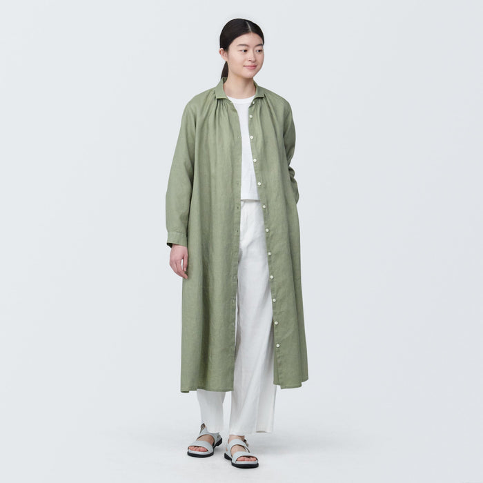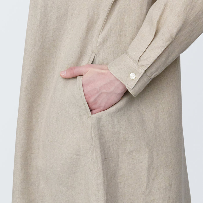 A shirt dress made with cool, breathable linen. It feature a soft, washed-out texture that fits and feels better with each wear. It can be worn buttoned up as a dress, or open as a light outer layer.