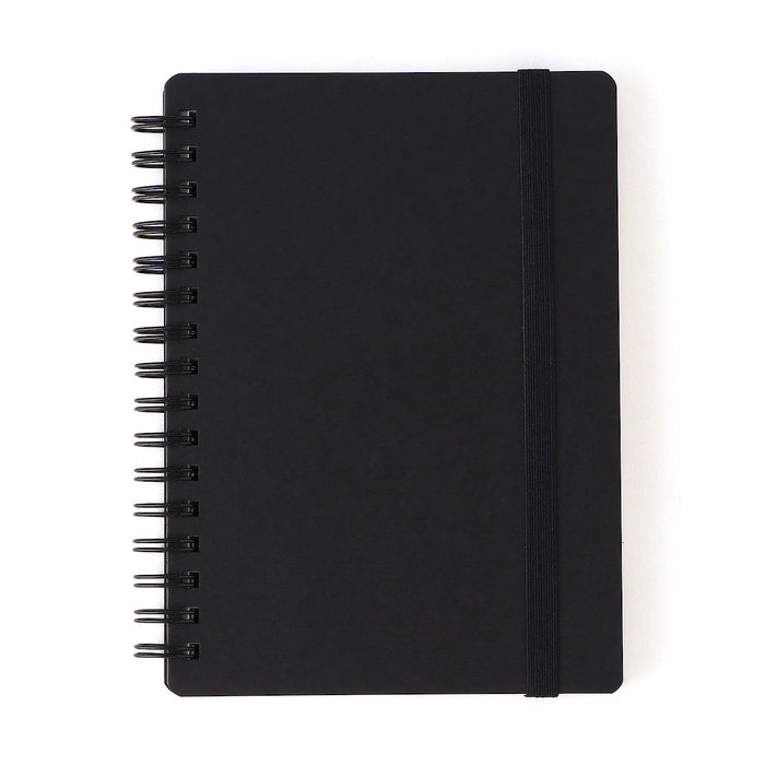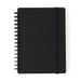 A lined notebook with high quality recycled paper that does not bleed through easily, and a sturdy paperboard cover. The double rings allow you to fully open the notebook and write from any direction, and the strap keeps the notebook closed for on-the-go usage.