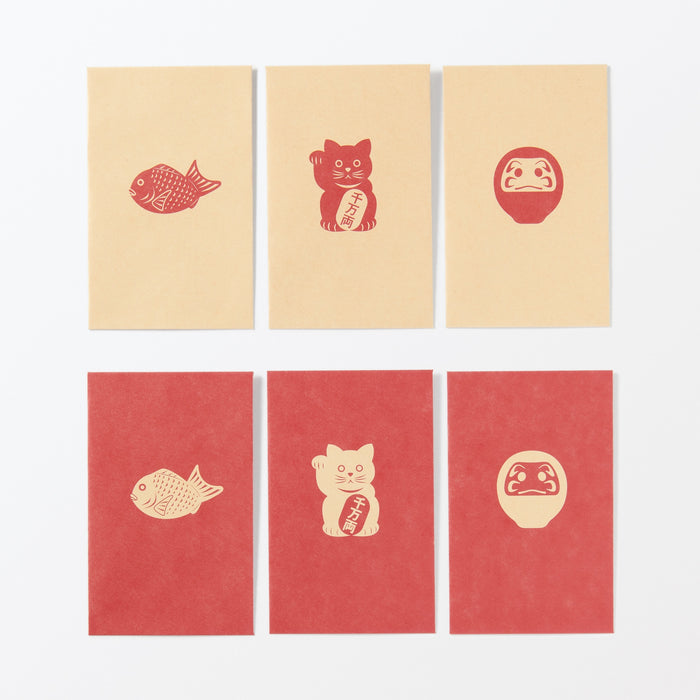 Simple and cute vertical W2.8 x L4.3" envelopes that are perfect for small message cards. Made from 100% Japanese bamboo paper and featuring designs of Japanese lucky charms. Comes in a pack of 3.