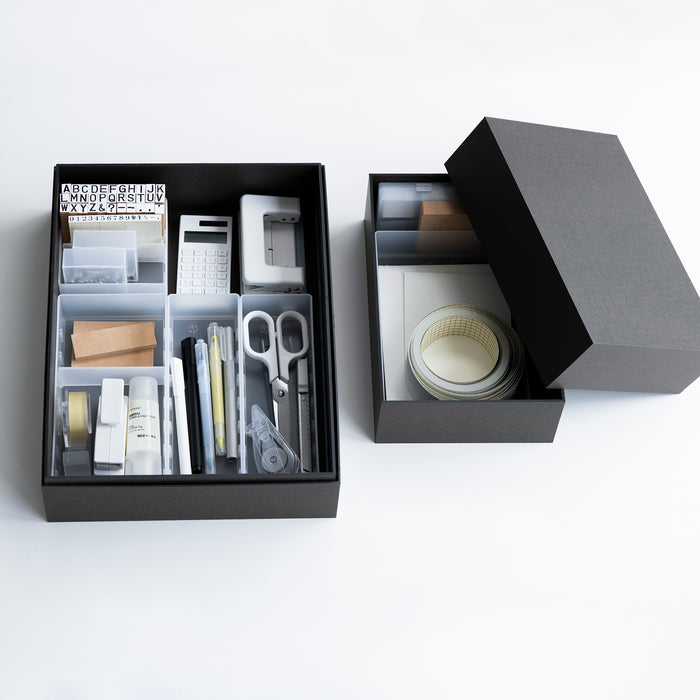 A convenient organizer box for desk drawers and surface to hold accessories or office supplies. Choose from 4 types designed to fit well together. Comes with 1 divider.