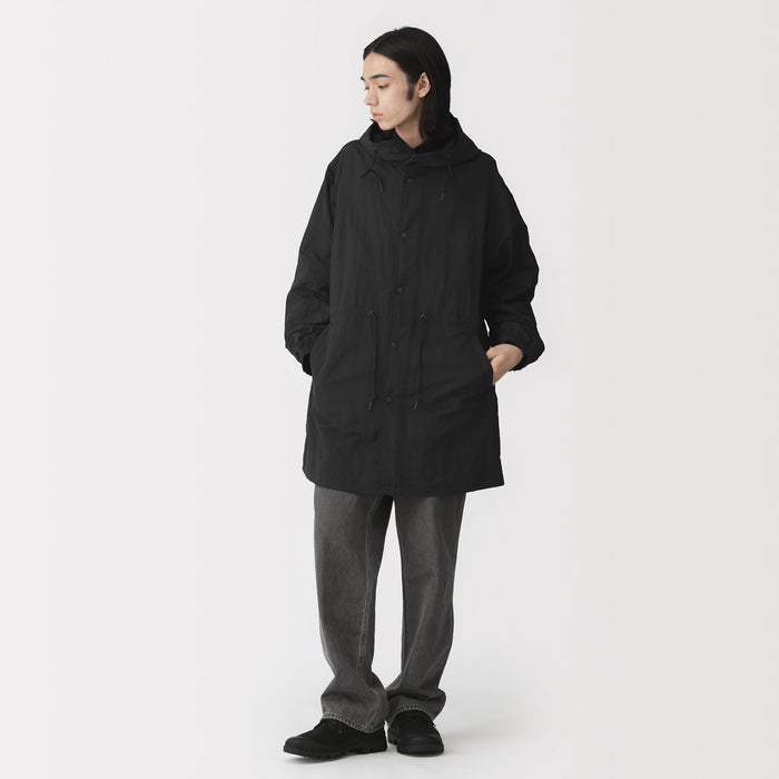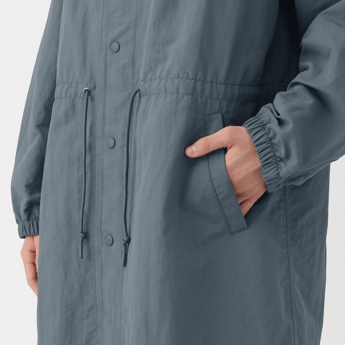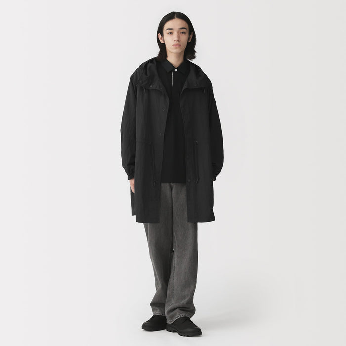Lightweight and water-repellent, this men's hooded coat is convenient for all seasons and occasions, perfect for layering in mild weather. It is made from a soft matte nylon material with a natural lightly wrinkled texture. The adjustable waist string allows you to adjust the silhouette, making it a great styling accent.