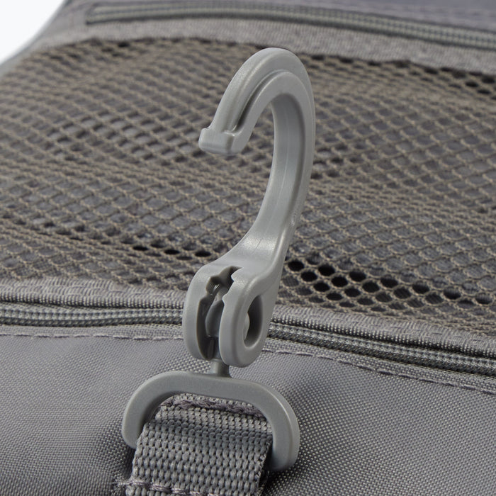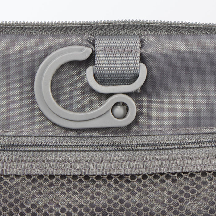 A hanging toiletry case perfect for travelling or maximizing small spaces. Simply hook this case onto an available surface and you can have all your essentials close by while saving counter space. Perfect height to fit MUJI 6.8 fl oz skincare products.