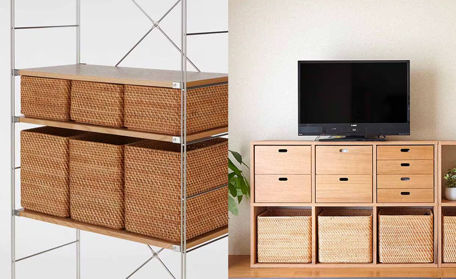 The size fits perfectly into MUJI storage furniture (unit shelves, stacking shelves, etc.).