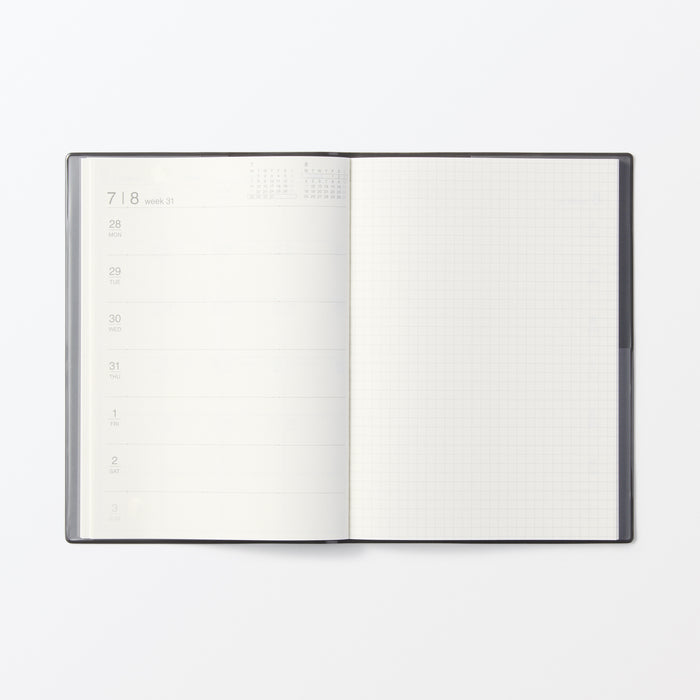 • Weekly horizontal pages on left pages, with blank grid page on right pages