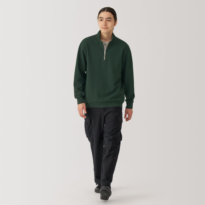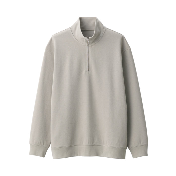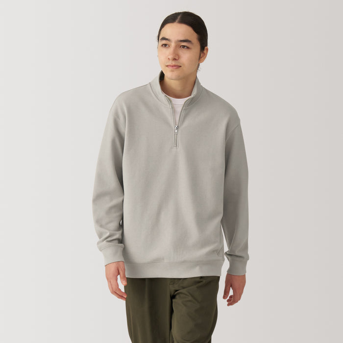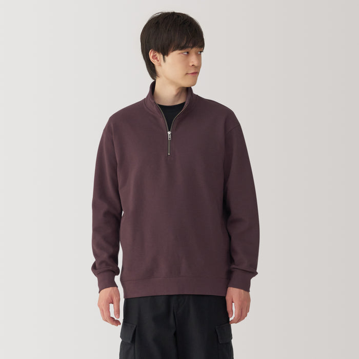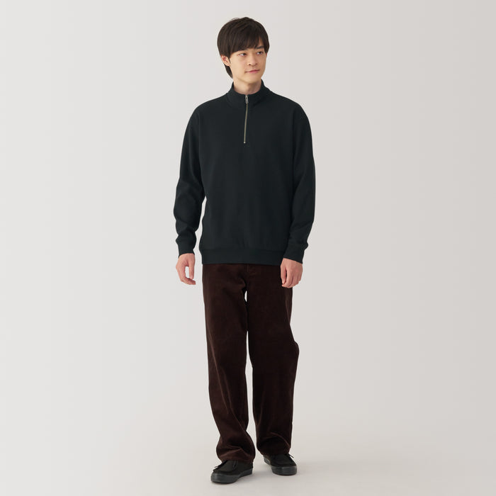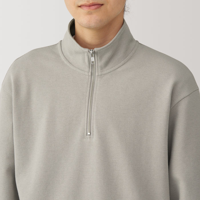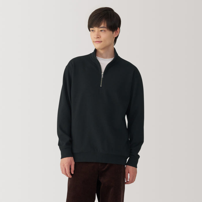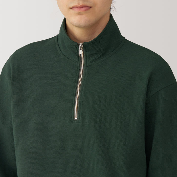 This men's half zip pullover is made with a blend of cotton and polyester. It is knitted in a double layered structure that keeps it airy and lightweight, with just the right amount of thickness for comfort. The material is smooth and glossy, giving it a clean and elegant look.