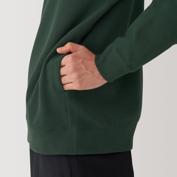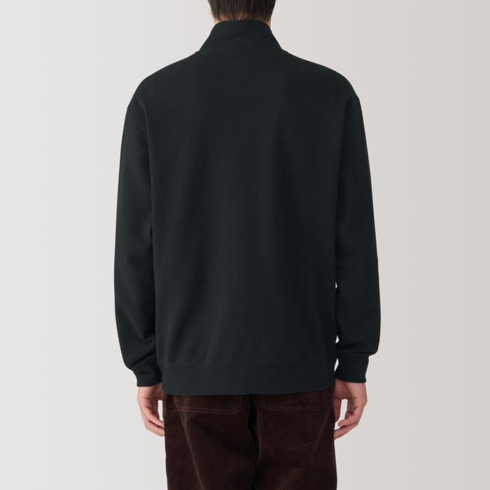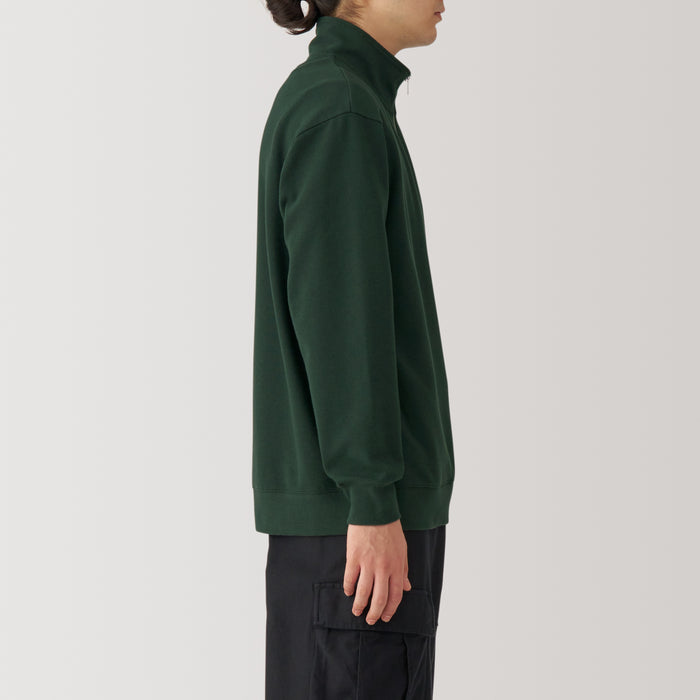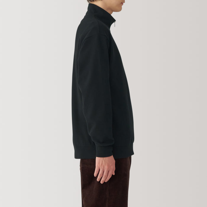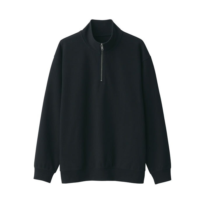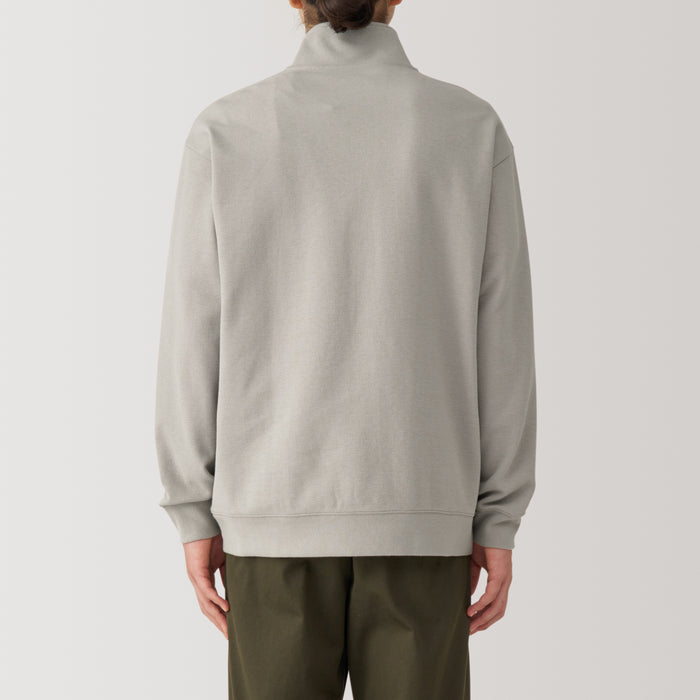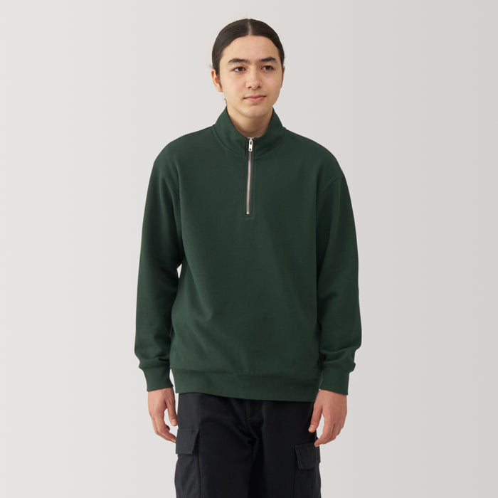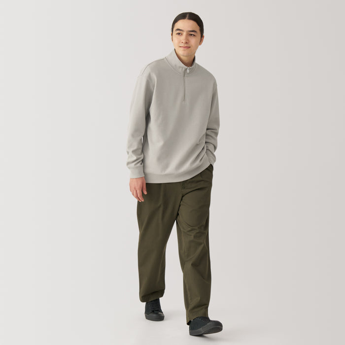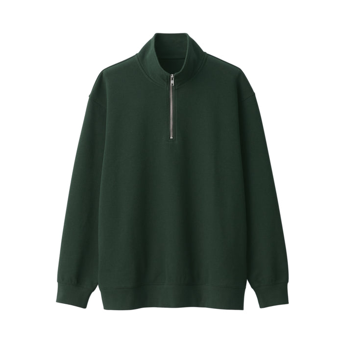 This men's half zip pullover is made with a blend of cotton and polyester. It is knitted in a double layered structure that keeps it airy and lightweight, with just the right amount of thickness for comfort. The material is smooth and glossy, giving it a clean and elegant look.