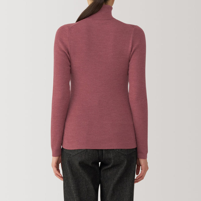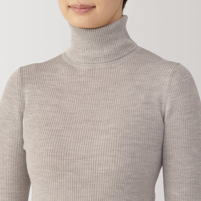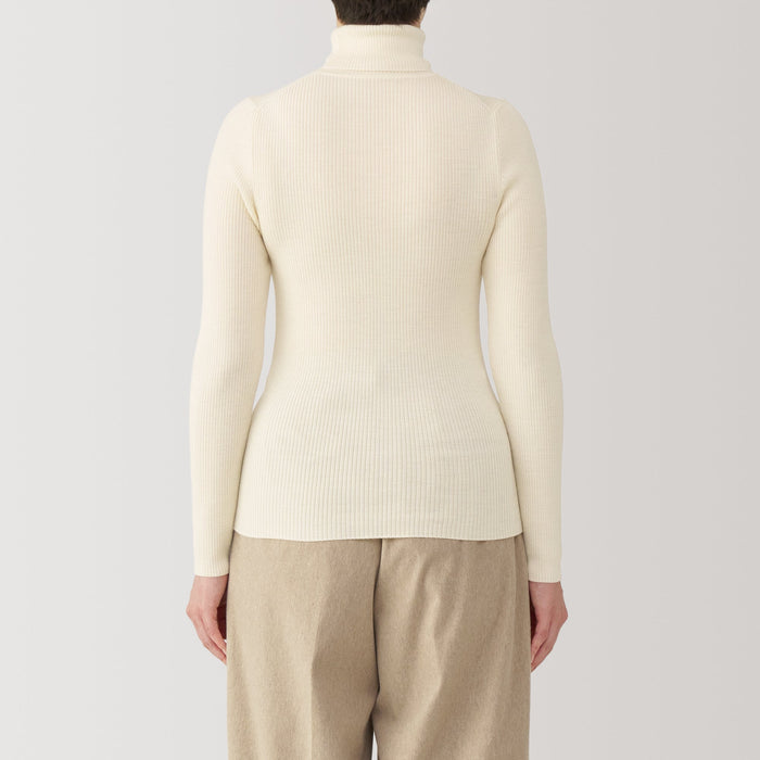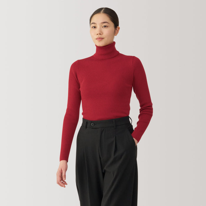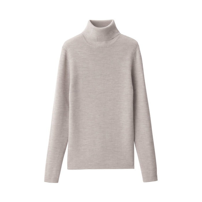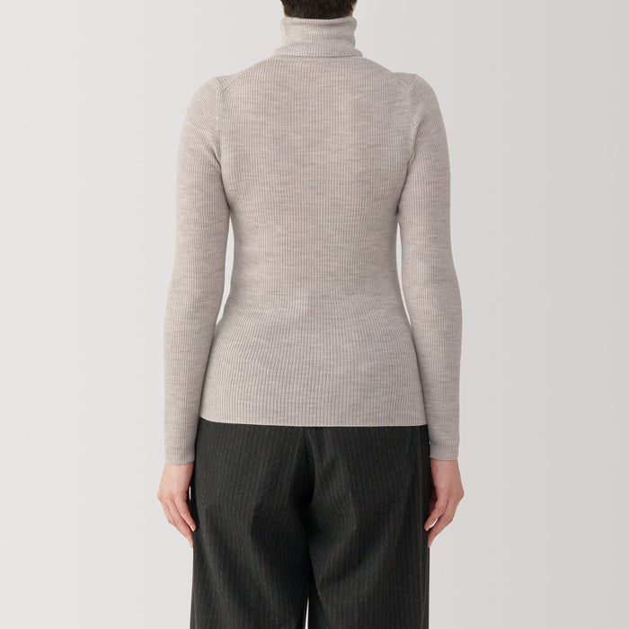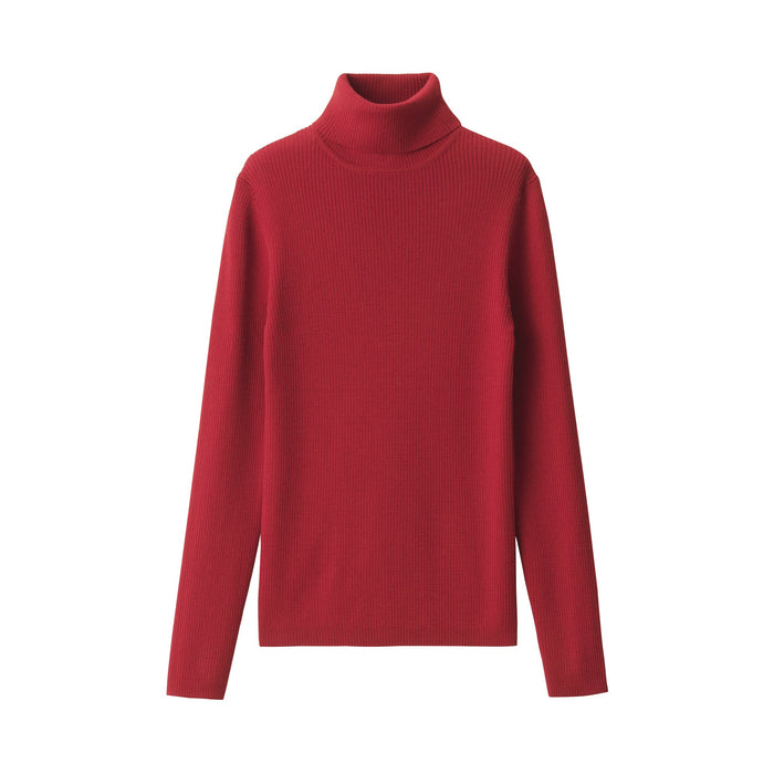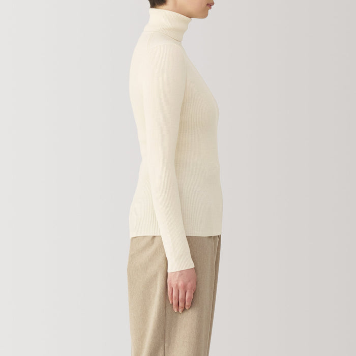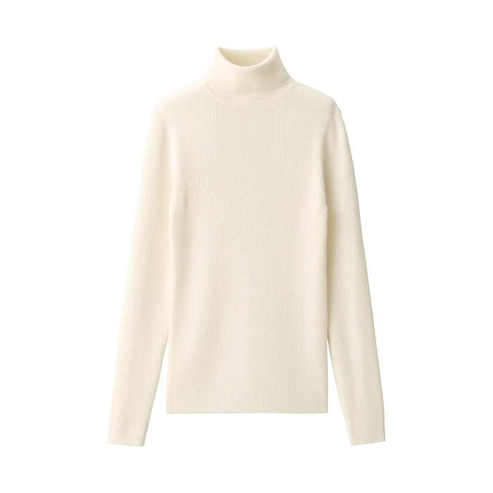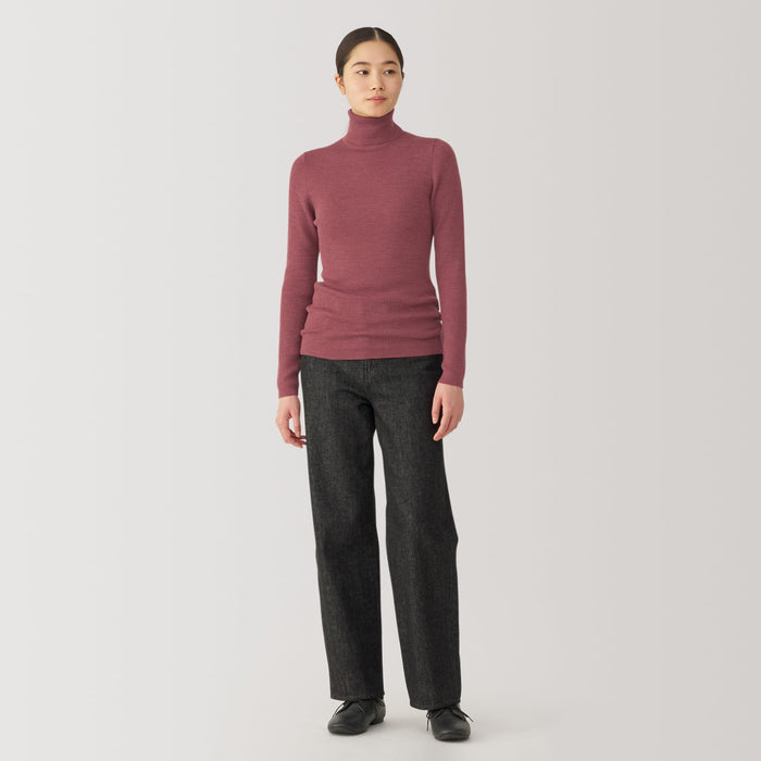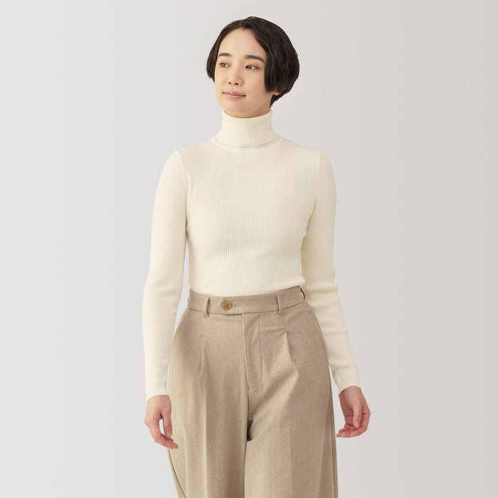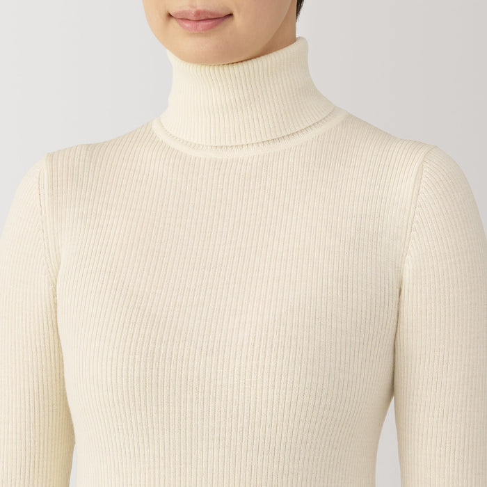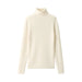 A turtleneck sweater made of warm wool, with an extra soft texture for comfort around the neck and reducing itchiness. Machine washable for convenient care at home.