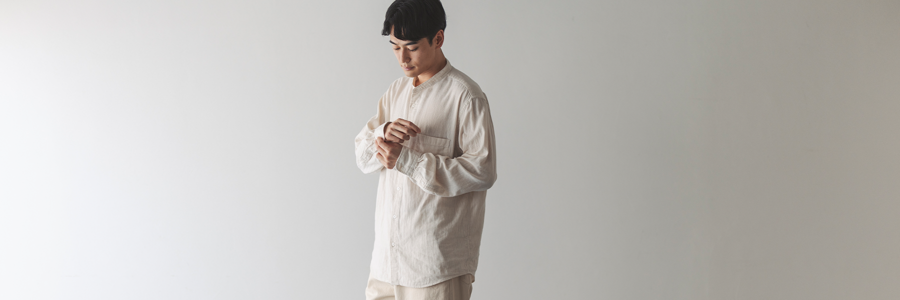 Men's Kapok Blend Double Gauze Stand Collar Long Sleeve Striped Shirt