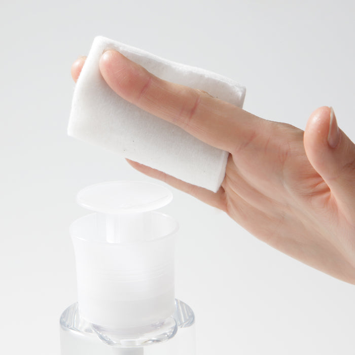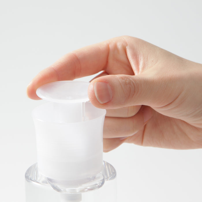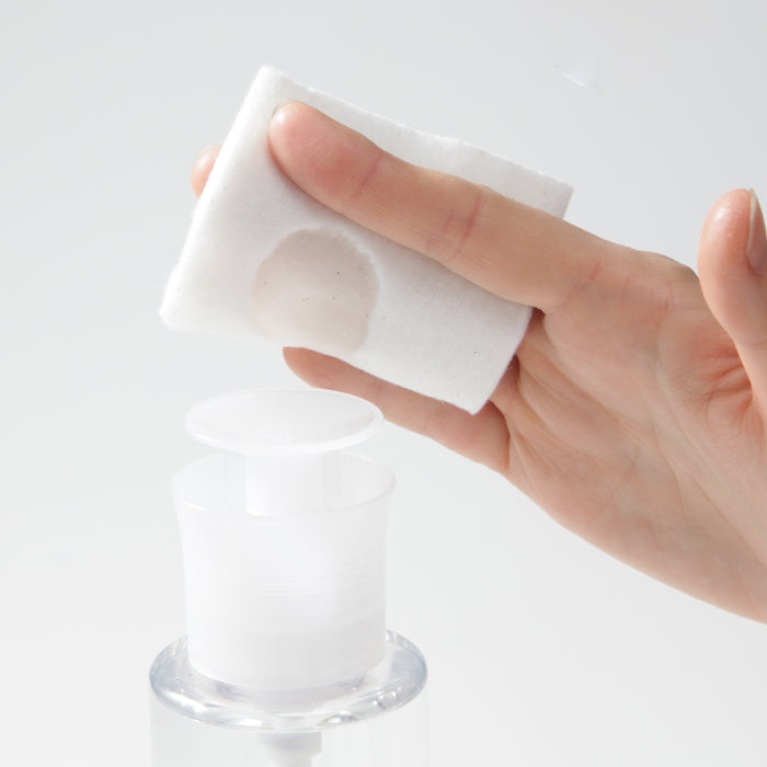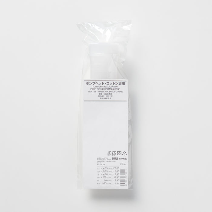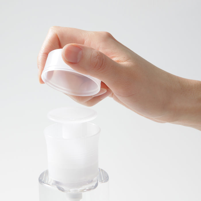 A replacement pump head made to be used with MUJI's toning water. Conveniently dispenses skincare onto cotton pads with a gentle press on top. The pump can be pushed with one hand without having to open and close a lid, allowing for quick skincare.