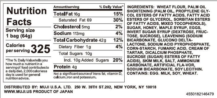 Wheat Flour, Palm Oil Shortening (Palm Oil, Propylene Glycol Esters Of Fatty Acids, Fatty Acid Esters Of Glycerol, Sorbitan Esters Of Fatty Acids, Mixed Tocopherols), Sugar, Honey, Maple Syrup, Eggs, Invert Sugar Syrup (Dextrose, Fructose, Sucrose), Leavening (Sodium Bicarbonate, Glucono Delta-Lactone, Sodium Acid Pyrophosphate, Cornstarch, Fumaric Acid, Cream Of Tartar, Dicalcium Phosphate, Sucrose (Sugar) Esters Of Fatty Acids), Skim Milk, Salt, Ammonium Carbonate, Artificial Flavor, Sodium Bicarbonate, Soy Lecithin.