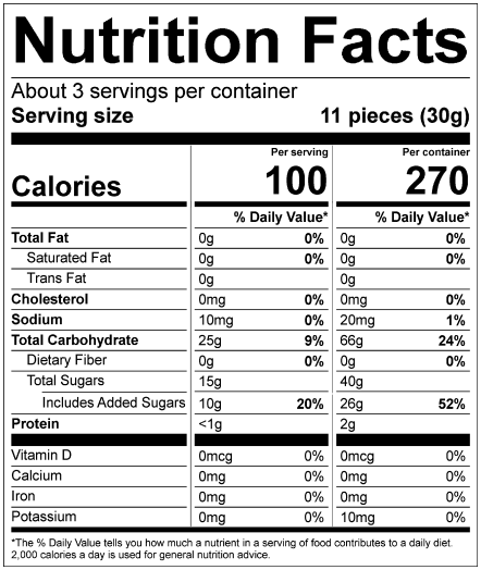Ingredients: Strawberry flavoured marshmallow [Corn syrup, Sugar, Gelatin, Cornstarch, Soy protein isolate, Artificial strawberry flavor, Beet powder {colour}], Strawberry filling [Corn syrup, Maltose, Sorbitol, Dextrose, Strawberry juice concentrate, Pectin, Sodium citrate, Strawberry powder, Citric acid, Apple juice concentrate, Artificial Strawberry flavor, Flavouring and acidifying agents (Acidifying agents {Citric acid, Sodium citrate, Malicacid, Lactic acid, Succinic acid, Tartaric acid}, Artificial strawberry flavor, High fructose corn syrup, Apple juice concentrate), Beet powder {colour}].
