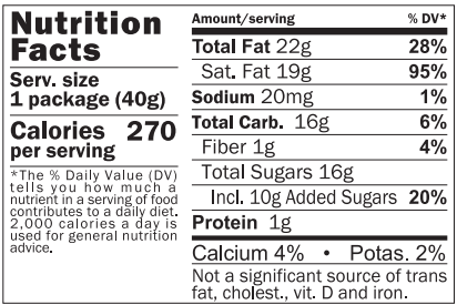 INGREDIENTS: White chocolate flavored coating (palm oil, sugar, whole milk powder, cocoa butter, skim milk powder, soy lecithin, sucrose esters of fatty acids, artificial flavor), dehydrated apple, citric acid, salt.