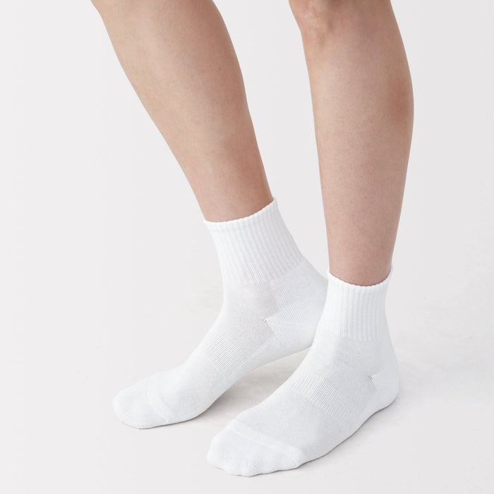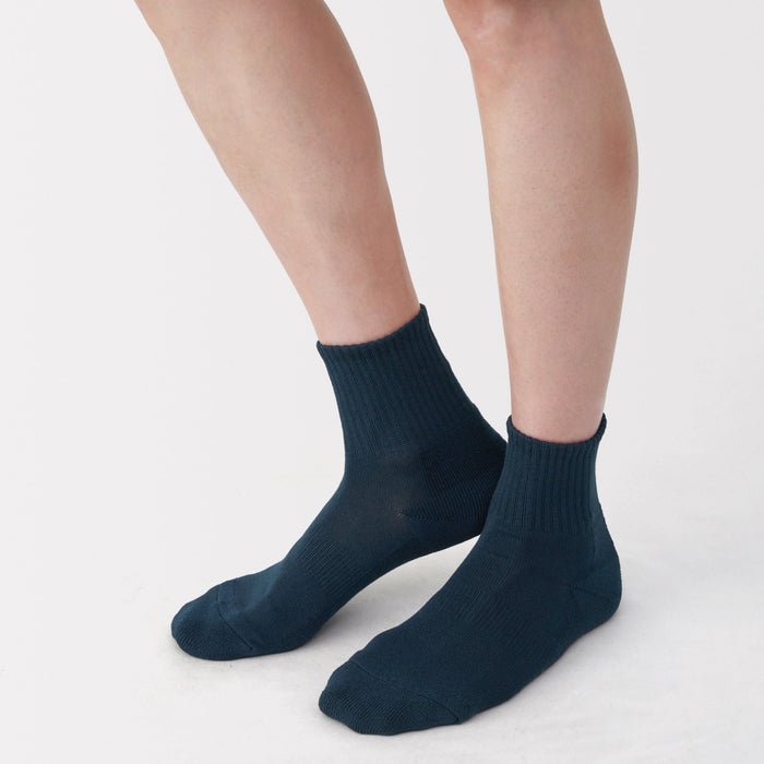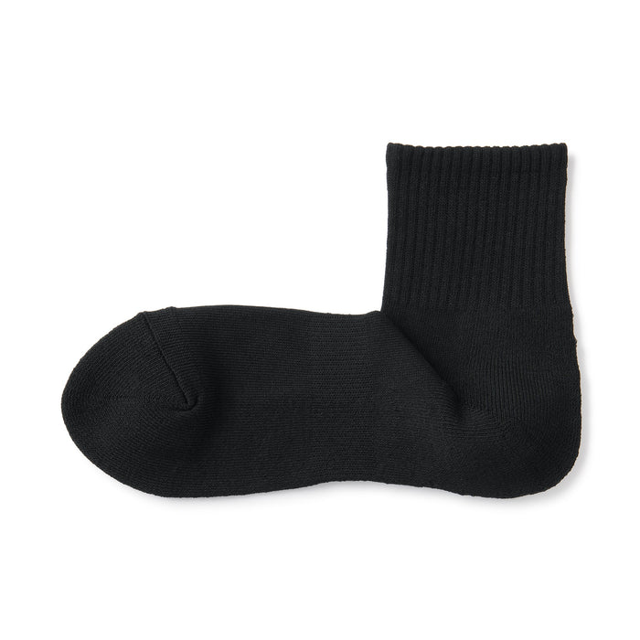 Soft pile-knitted sole with a sweat de-odorizing effect. The heel of the socks is knitted at a right angle to wrap comfortably and naturally around the heel.