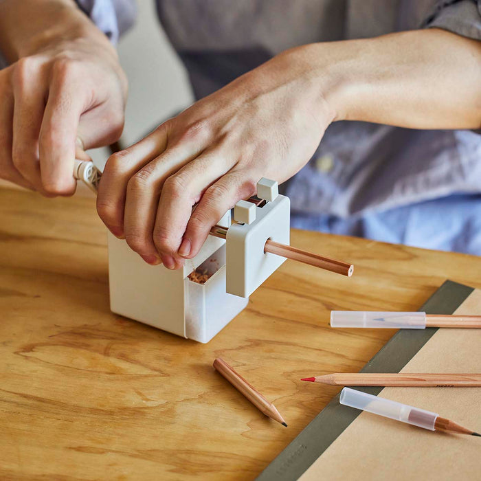 A simple manual pencil sharpener. With a built in compartment to collect pencil shavings for easy clean up.