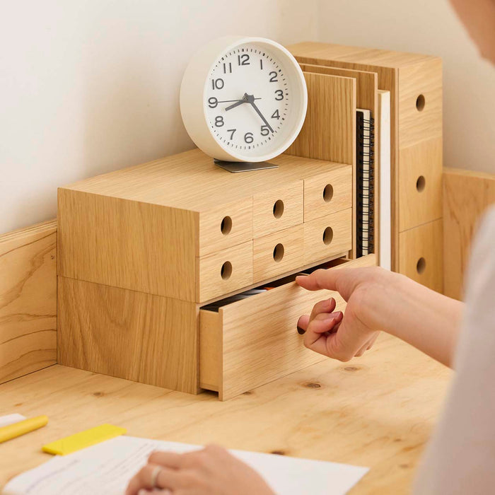 The surface is finished with oak to fit in with the interior environment. Finished in a convenient size to organize things on your desk. A partition plate is attached so that it can be divided inside. The standard capacity for stacking is 3 units.