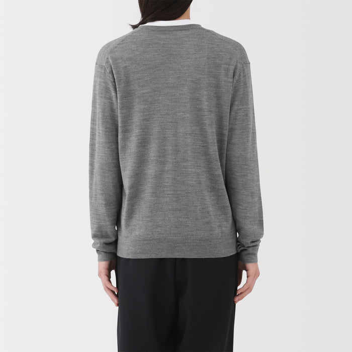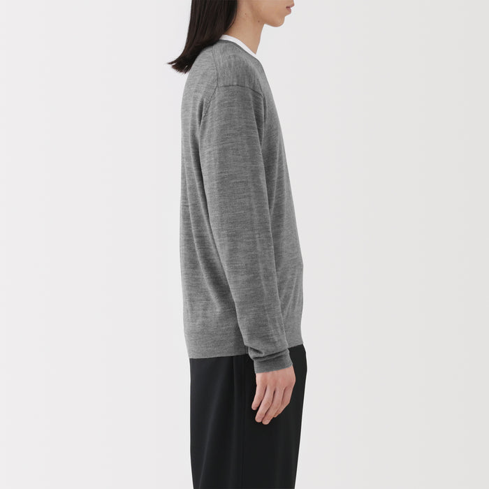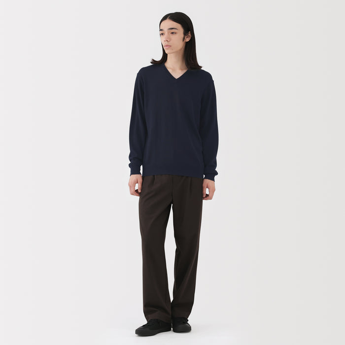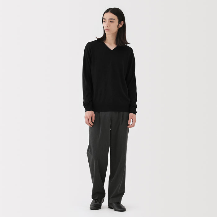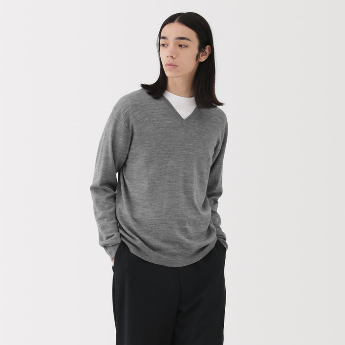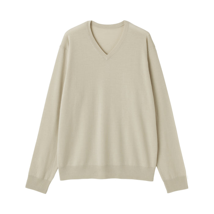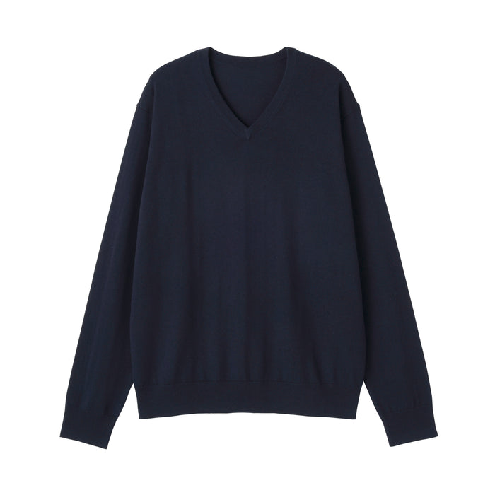 This men's V-neck sweater is soft and cozy, made from fine, durable high-gauge wool thread that is smooth on the skin. The thin wool material ensures warmth for versatile styling on its own or as a layering piece on chilly days. It also features a shrink-proof finish, making it easily washable at home.