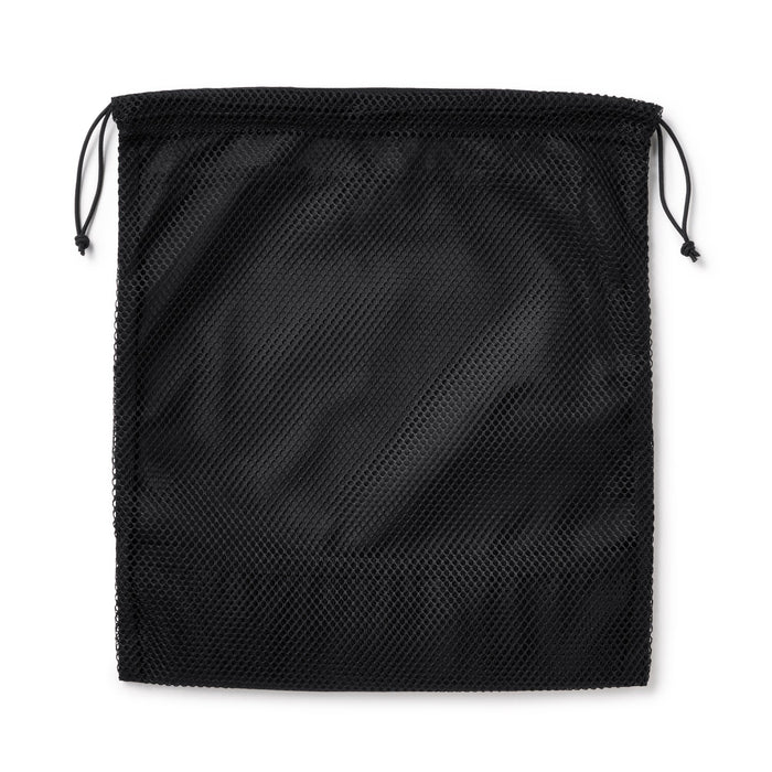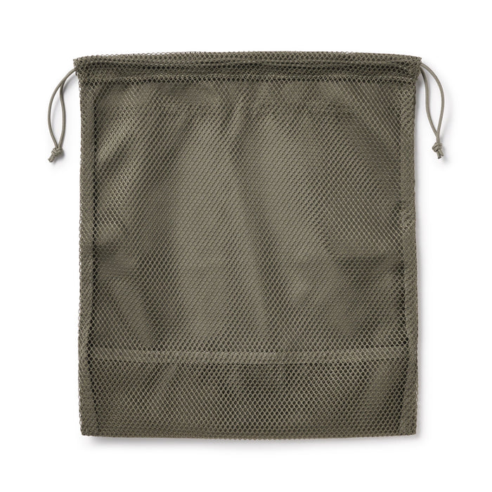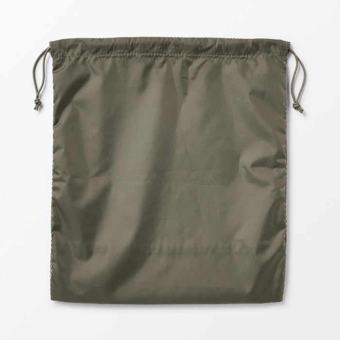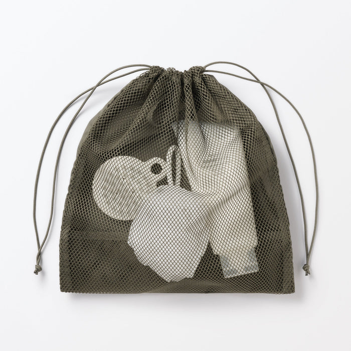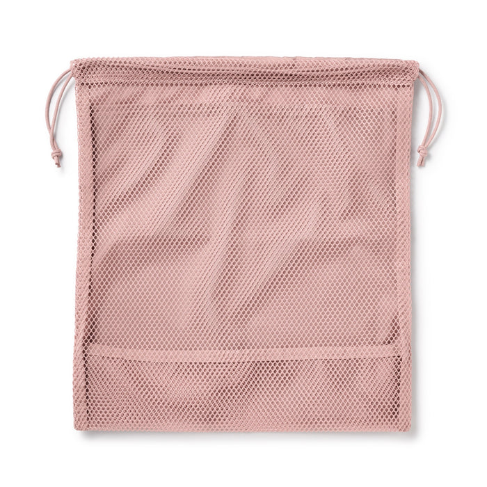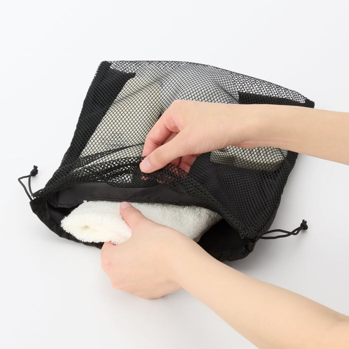 A double-layer mesh drawstring bag with an internal divider that's perfect for travelling. You can store items meant to be visible in the mesh layer, and those intended to remain hidden in the fabric-enclosed side. The attached loop can be used as a carrying handle, and it can also hang conveniently on hooks in places like airplanes or hotels.