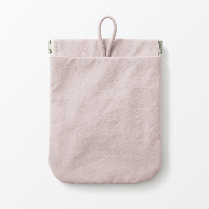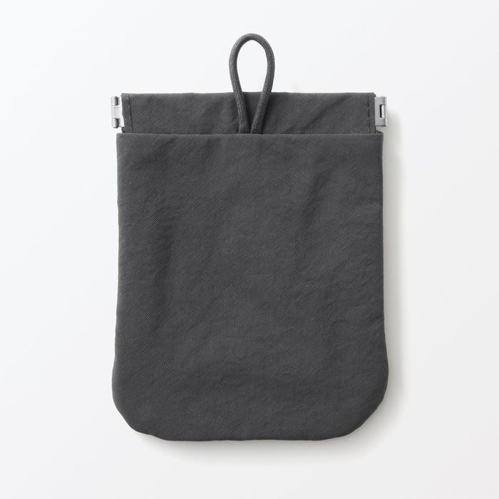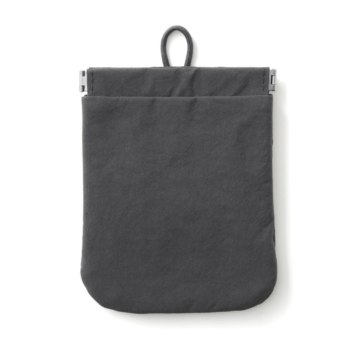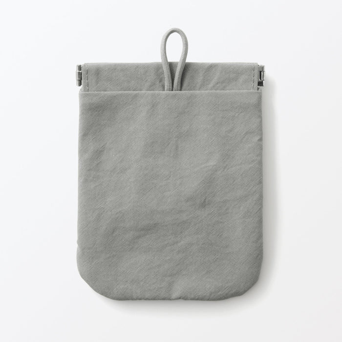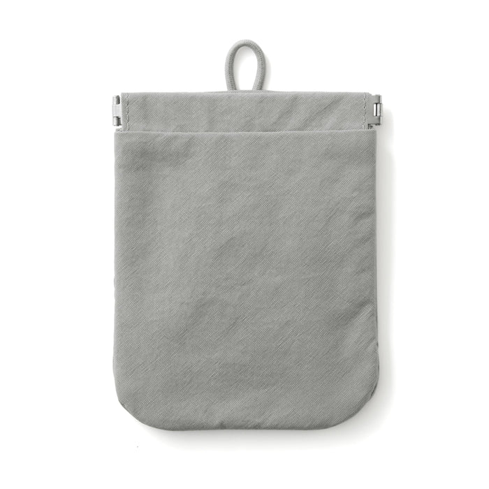 A small flat travel pouch made from sturdy nylon fabric with a distinctive wrinkled texture. It has a spring-loaded opening that is easy to open with one hand. This pouch is convenient for organizing small items that are used often, such as lip balm, medicine, and keys. There is a loop for hanging and attaching the pouch to your bag.