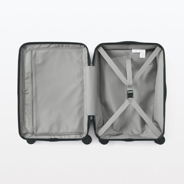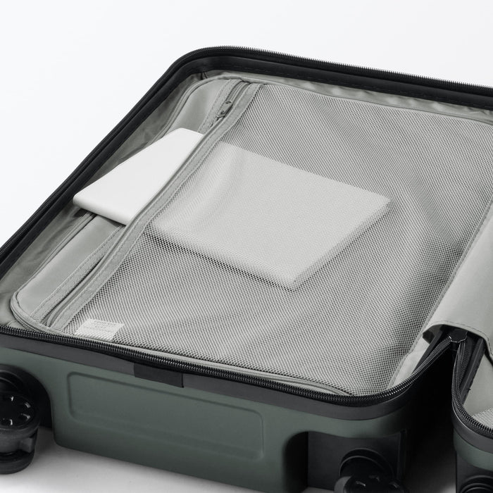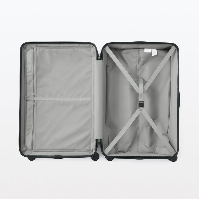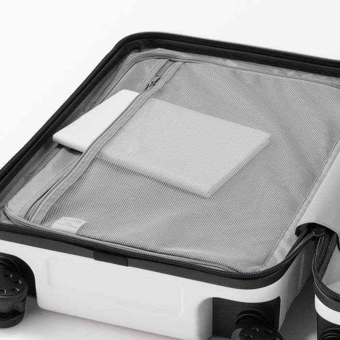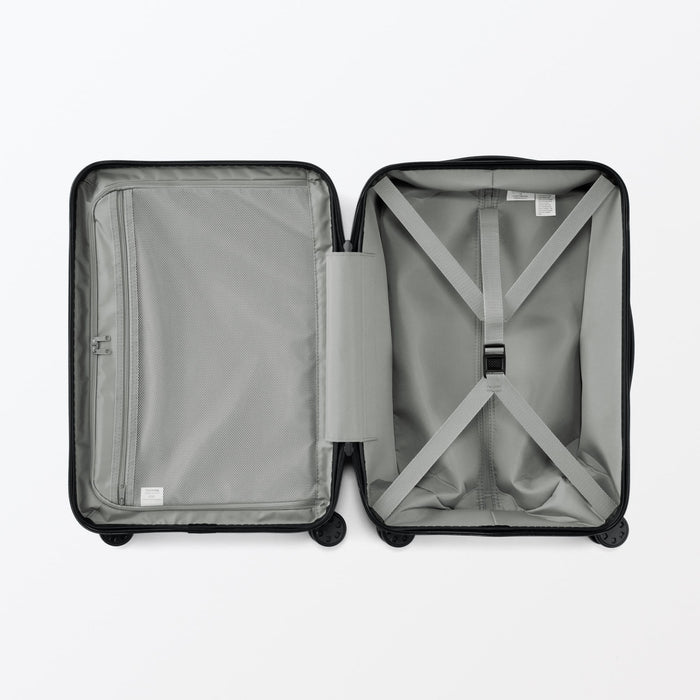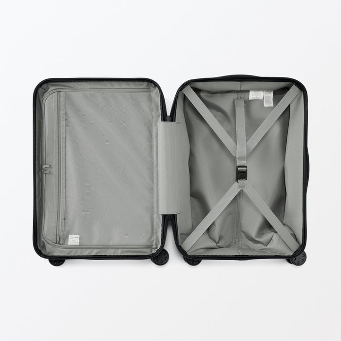 The interior has a buckle strap and zippered partition with a mesh pocket to keep your clothes and essentials in place while in transit. Our wide range of packing cubes also fit perfectly inside the suitcase for even more organization options!
