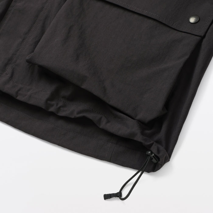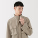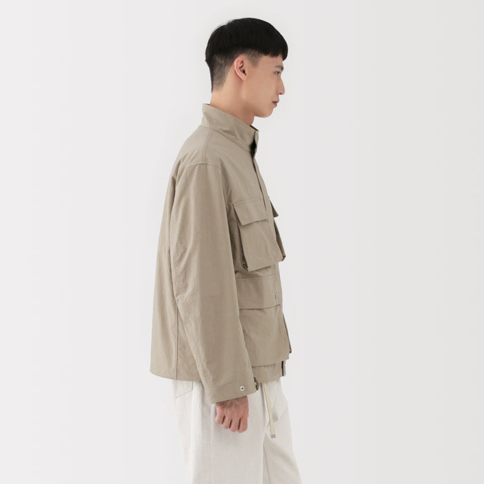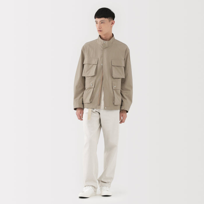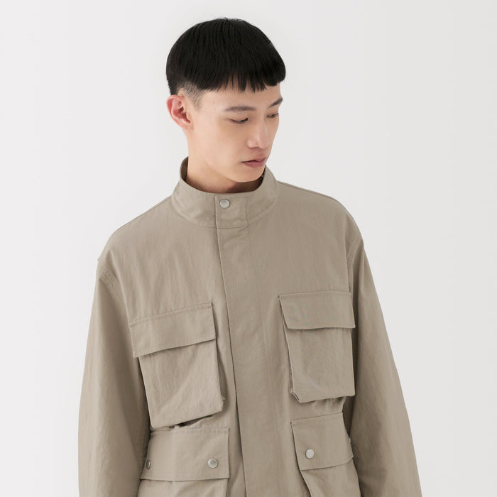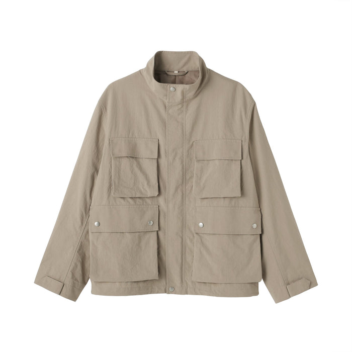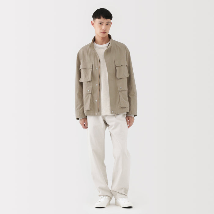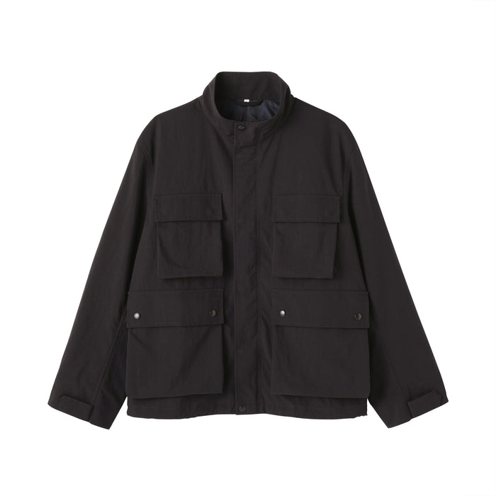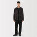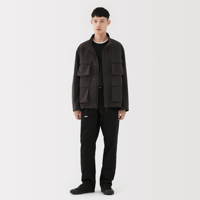 A men's work jacket made mainly of short-fiber nylon thread for a springy, cotton-like texture. Featuring practical large pockets on the front that give it a casual, industrial-inspired appearance.