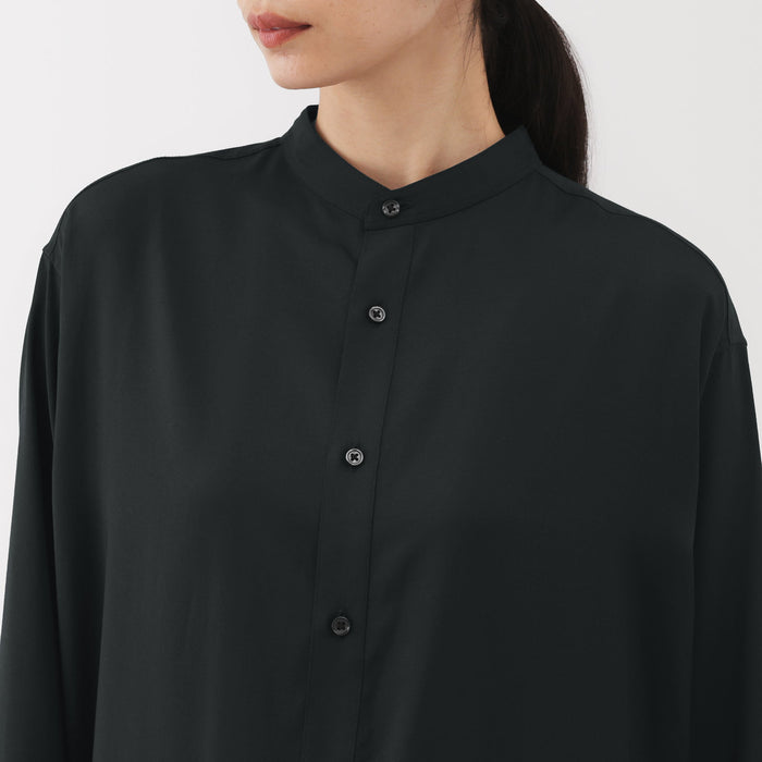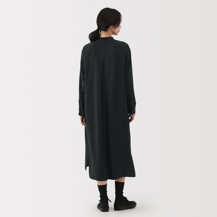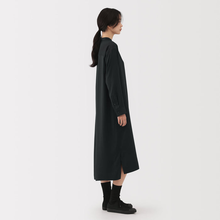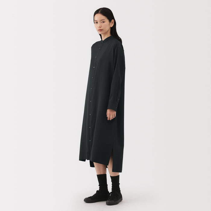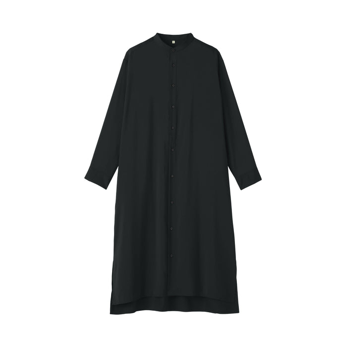 This button-up women's shirt dress is made partially with plant-based materials and features a boxy, relaxed fit. The front of the dress is slightly shorter than the back for an interesting silhouette.