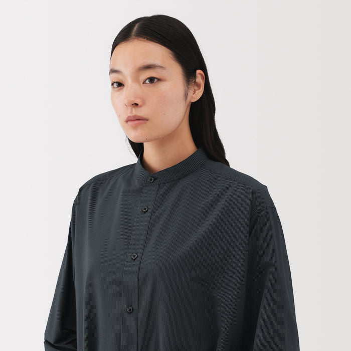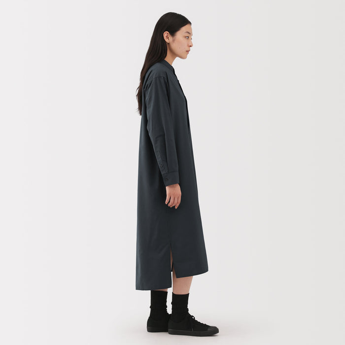 This button-up women's shirt dress is made partially with plant-based materials and features a boxy, relaxed fit. The front of the dress is slightly shorter than the back for an interesting silhouette.