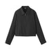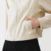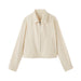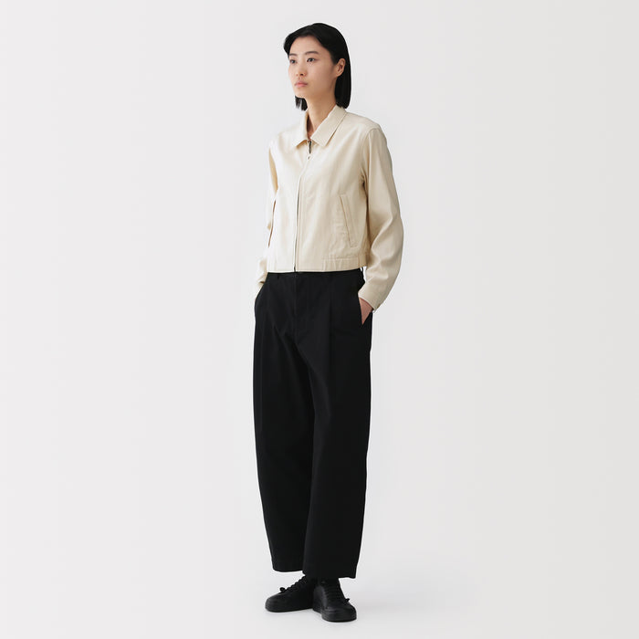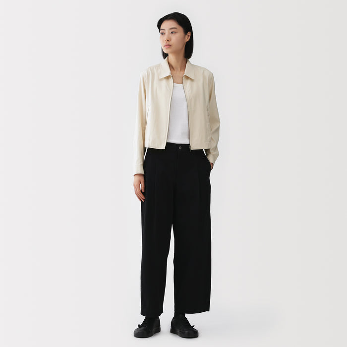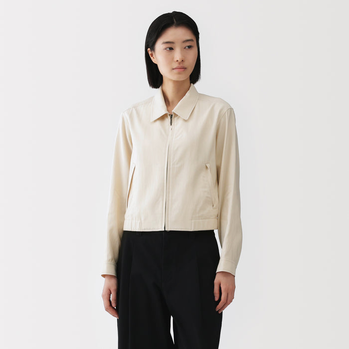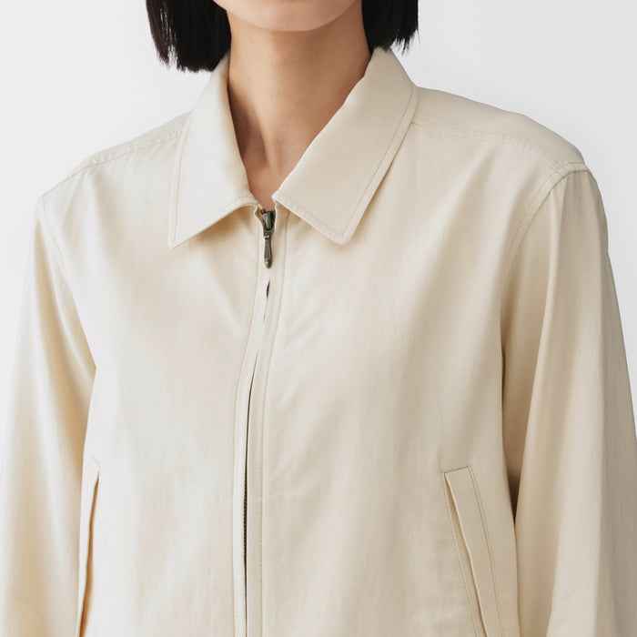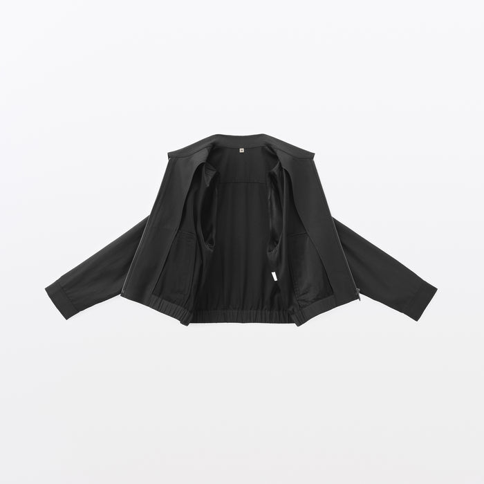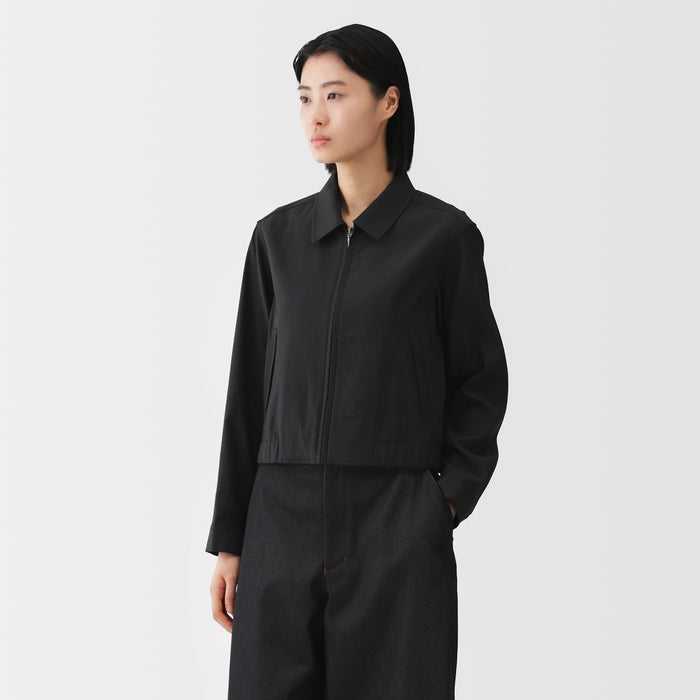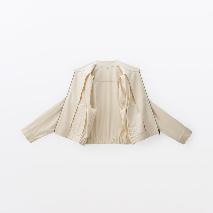 This women's short collared blouson is made with a soft rayon-cotton blend for a gentle and comfortable texture on the skin.