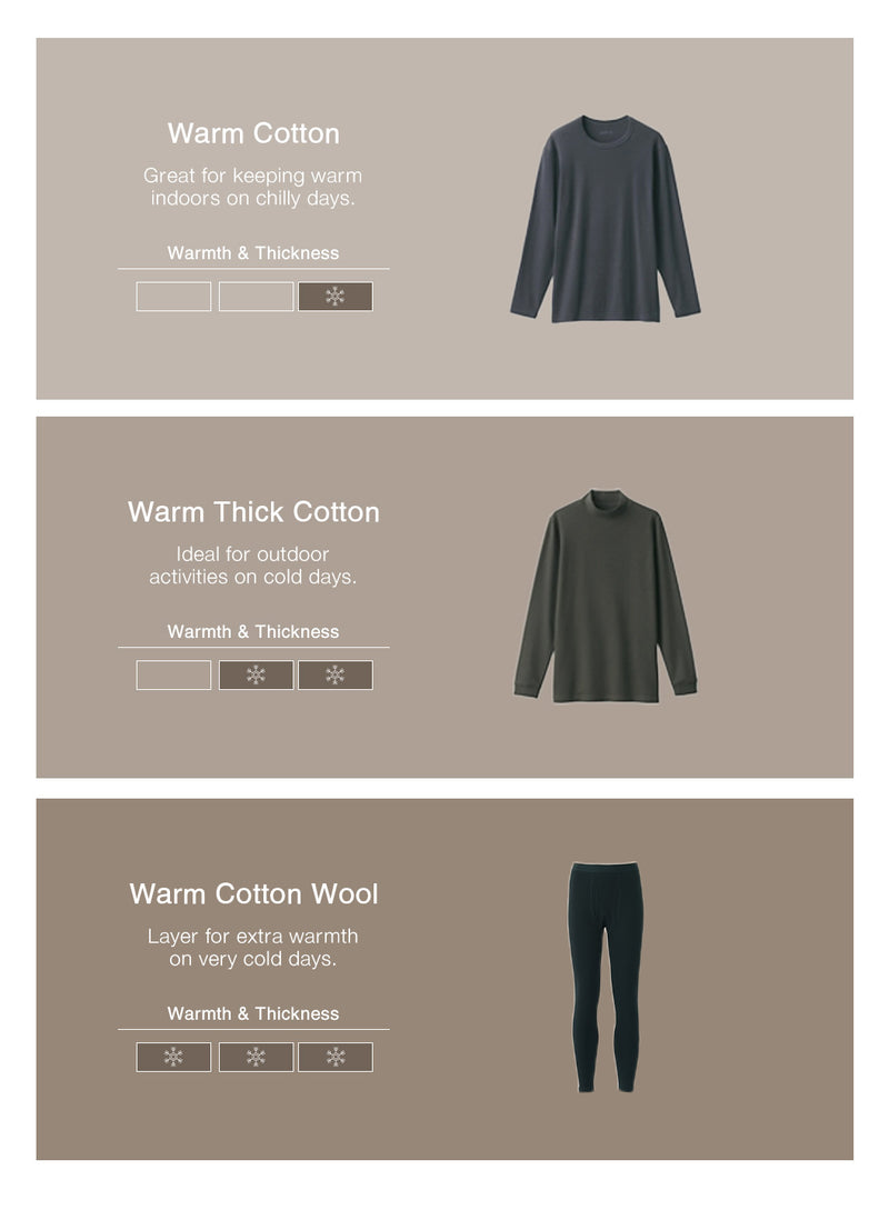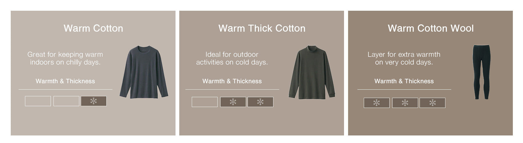By improving the knitting method, the 100% cotton* material is warm and soft against the skin. It fits gently to the body, so you can stay comfortable even in the cold winter.