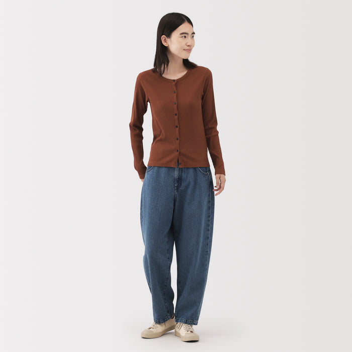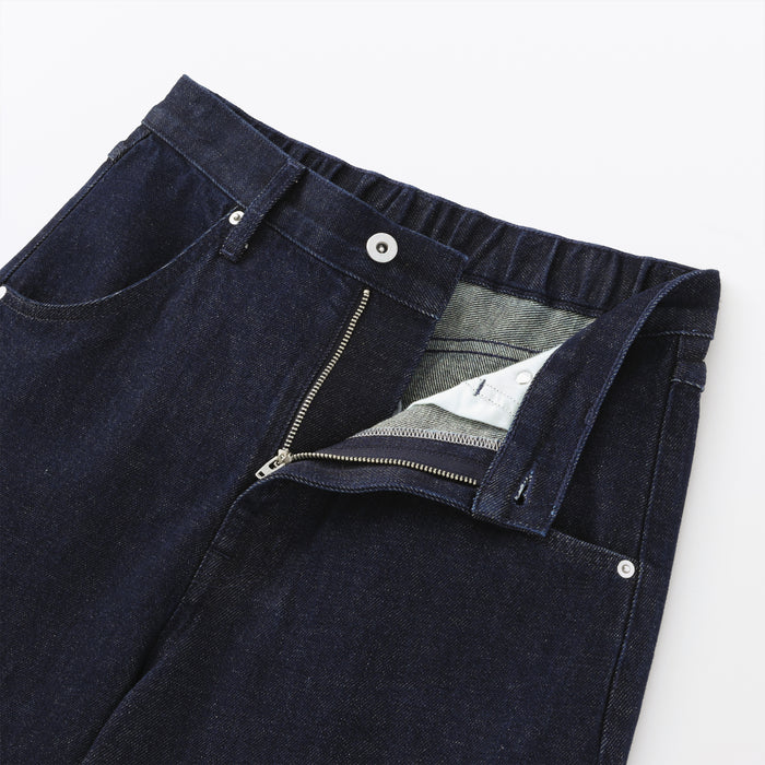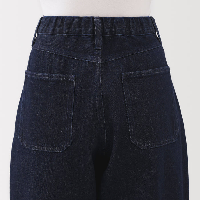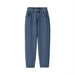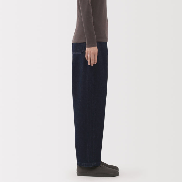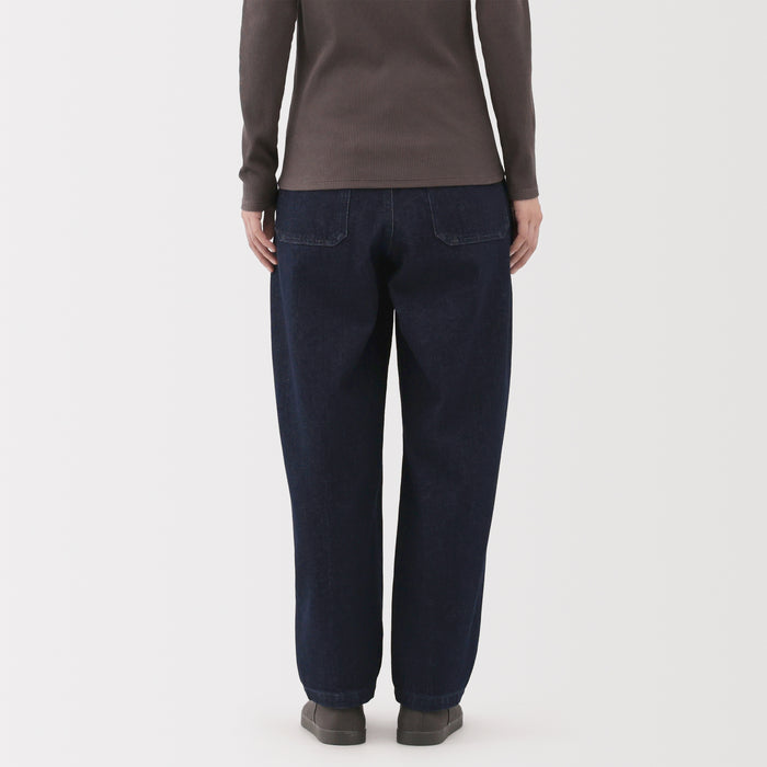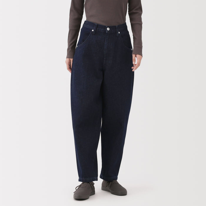 These denim pants are made from a blend of organic cotton and kapok fibers, making them lightweight and comfortable. The legs have a loose and subtle curved silhouette that tapers at the ankle for a fit that is both comfortable and flattering on any body type.