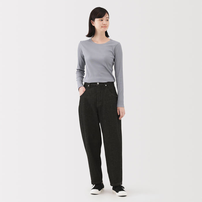 These denim pants are made from a blend of organic cotton and kapok fibers, making them lightweight and comfortable. The legs have a loose and subtle curved silhouette that tapers at the ankle for a fit that is both comfortable and flattering on any body type.