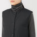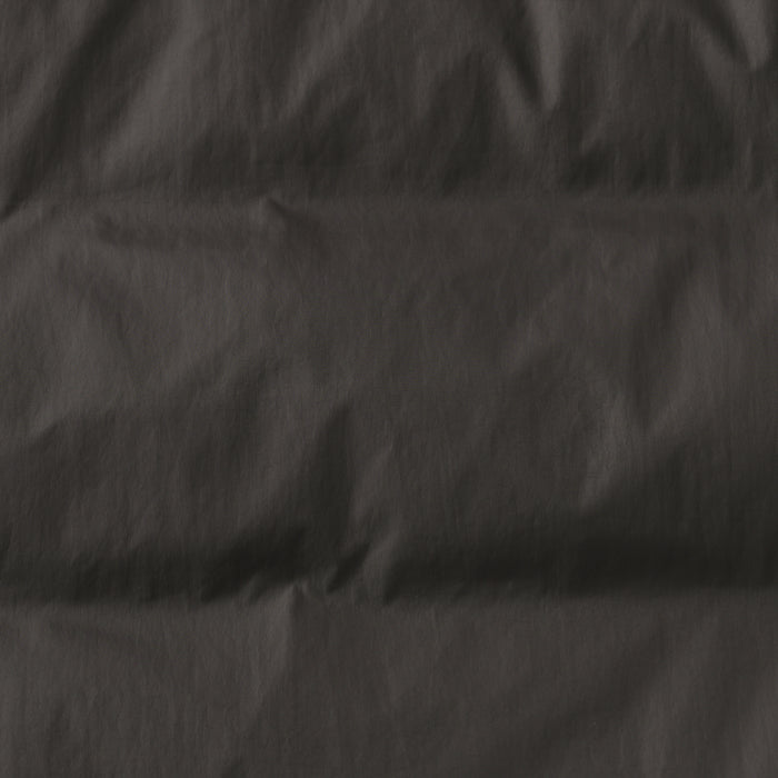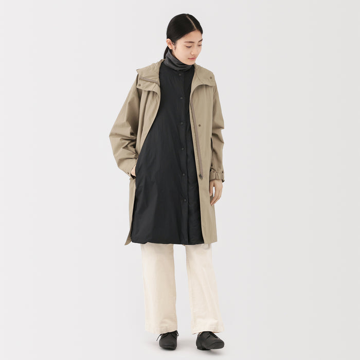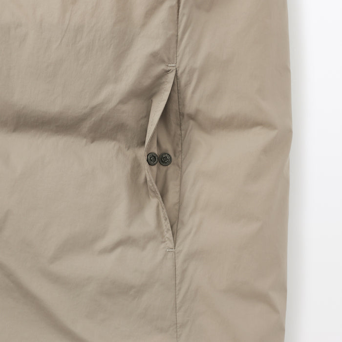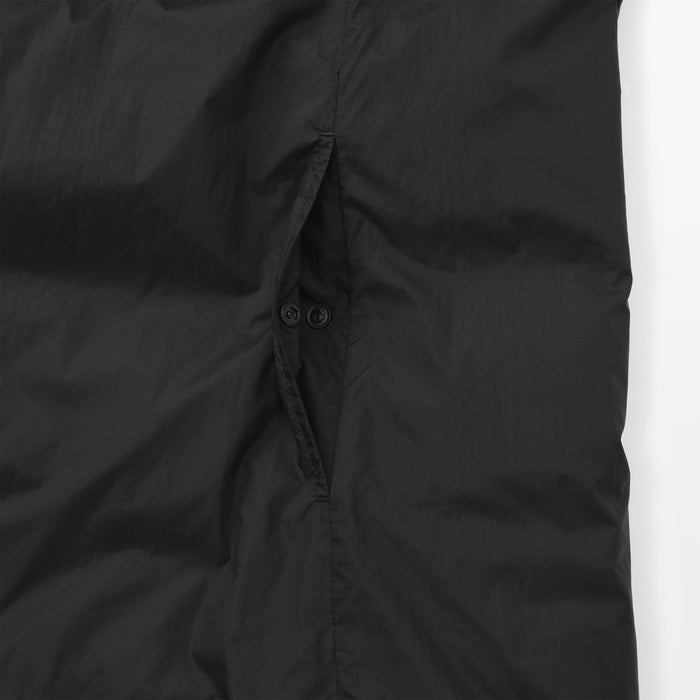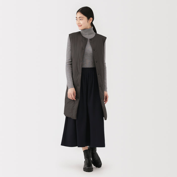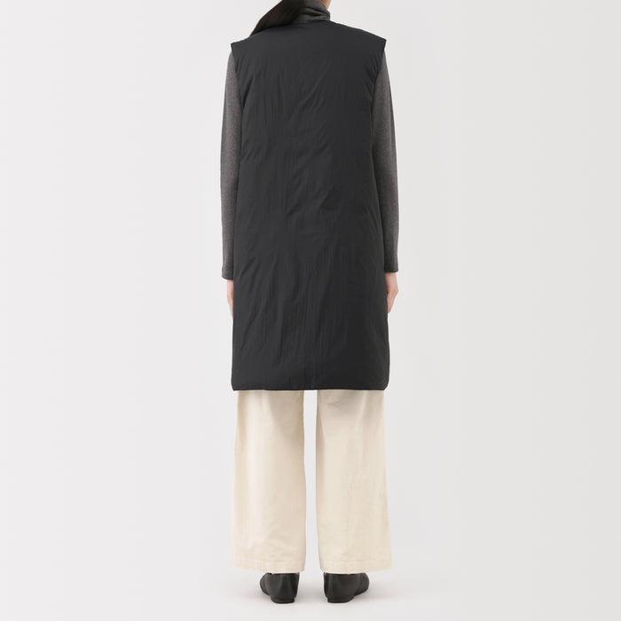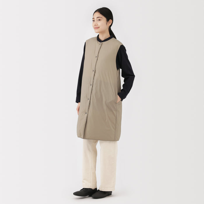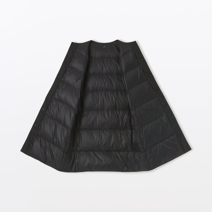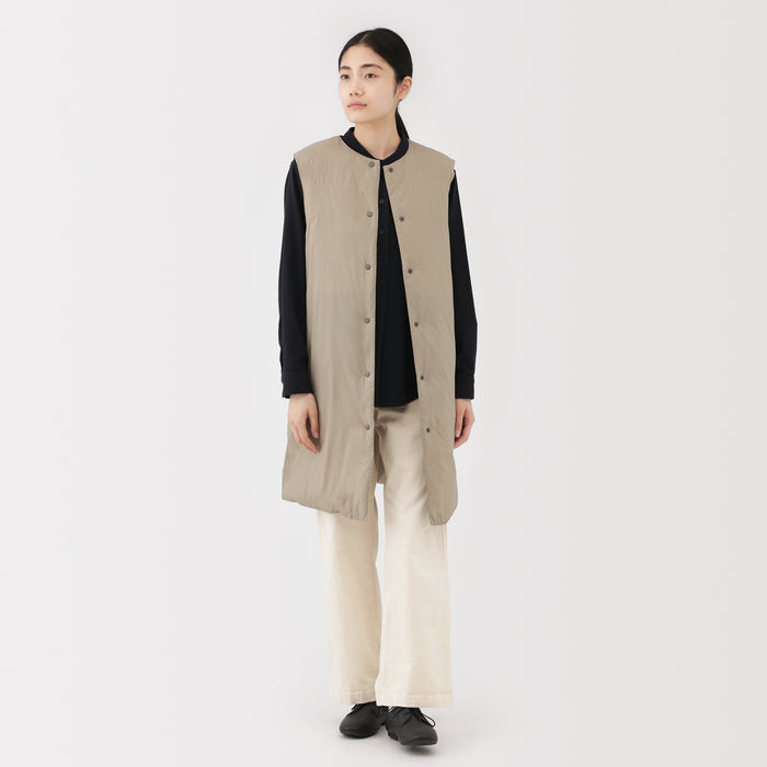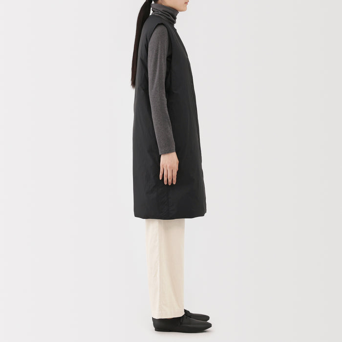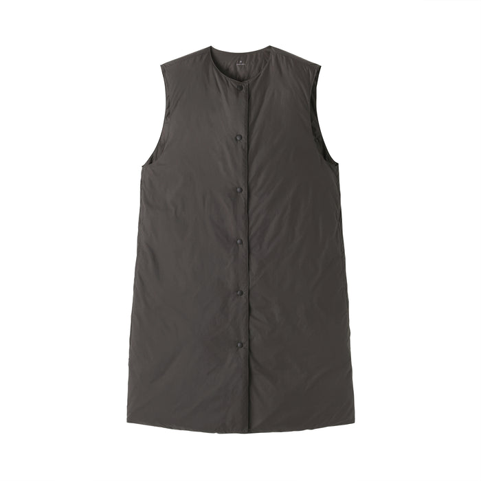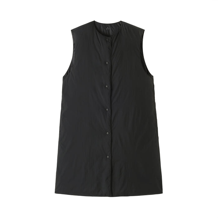 A women's lightweight down collarless long vest made with recycled nylon fabric and fill power 750 down. Designed to be foldable and easy to carry. Thick and light enough to be layered in the winter.
