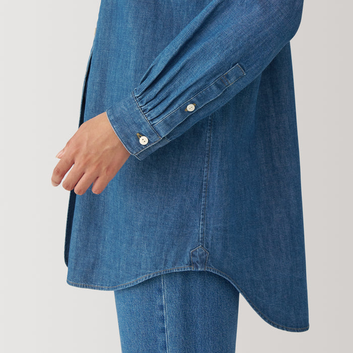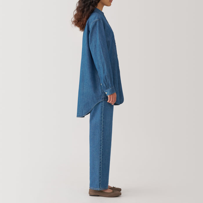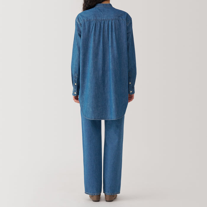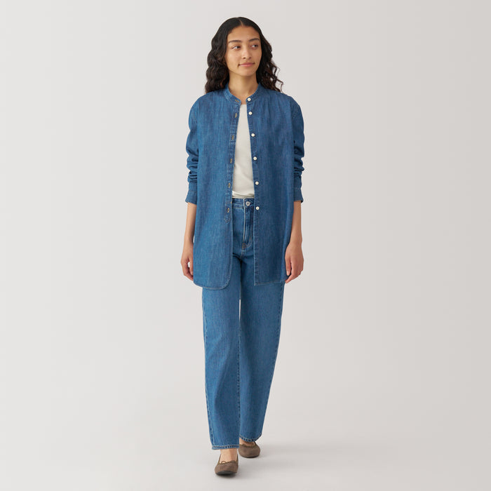 A denim stand collar shirt that fits and feels better with each wear and wash. This long, tunic-style shirt looks great whether it's buttoned up or open. Made with organic cotton.