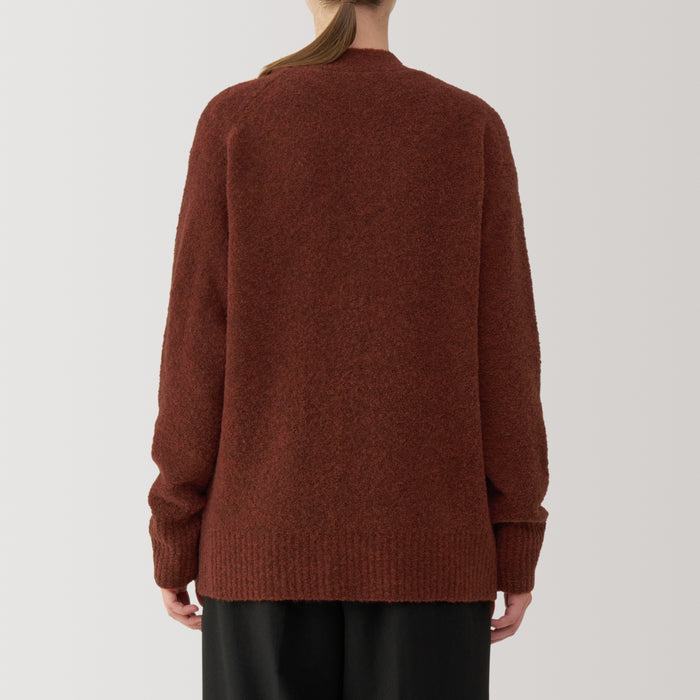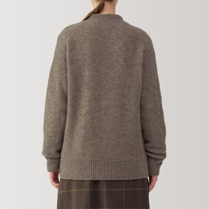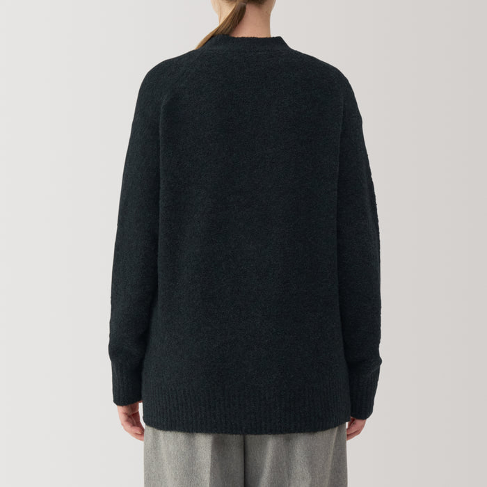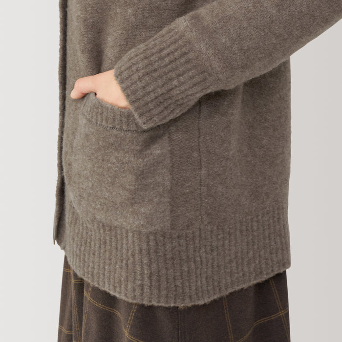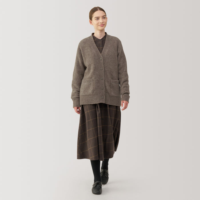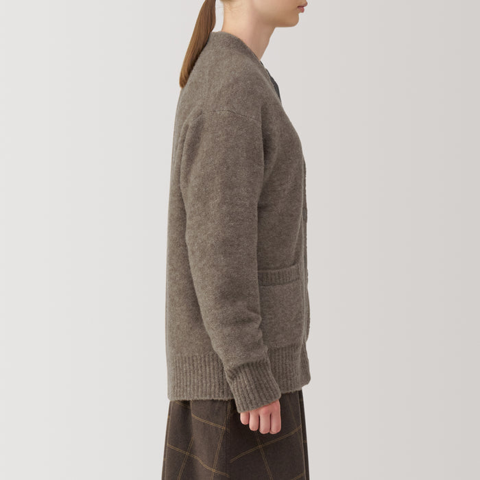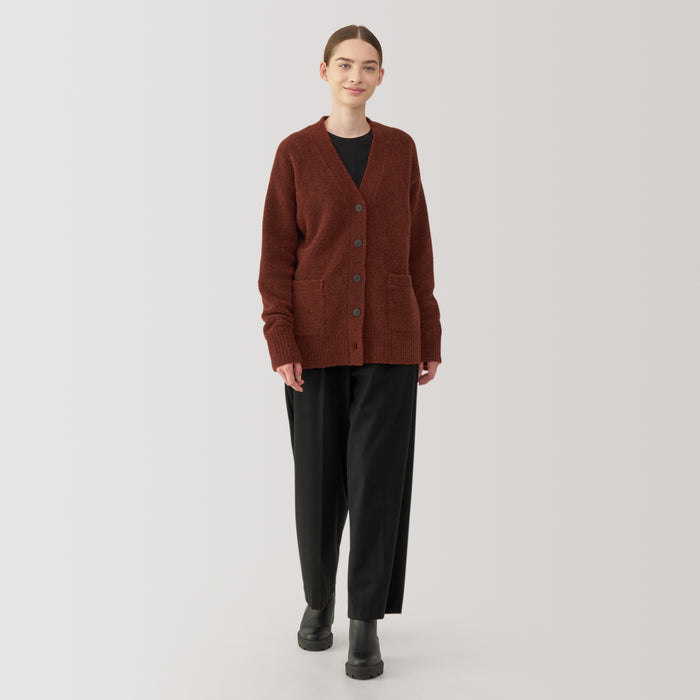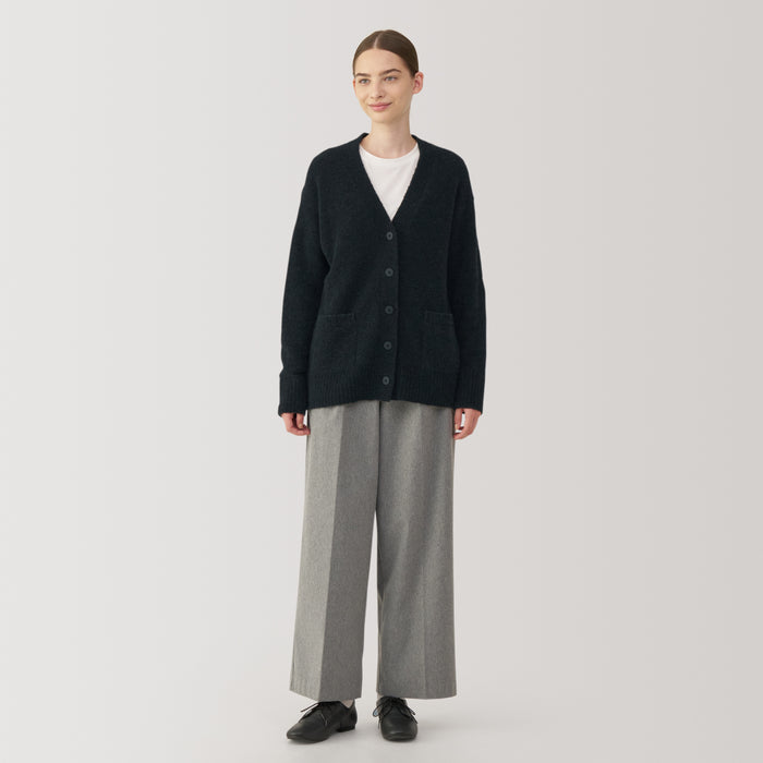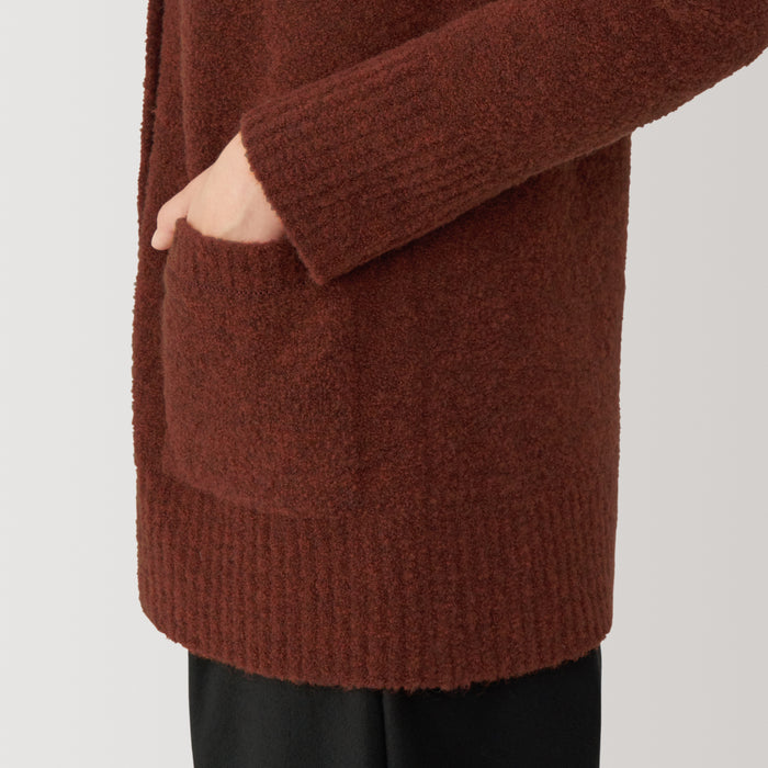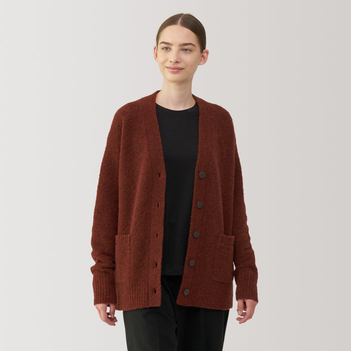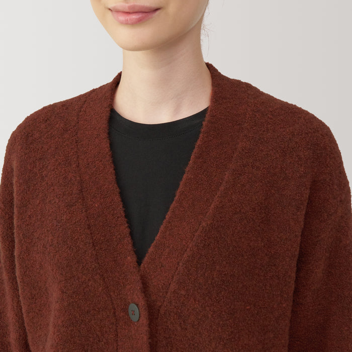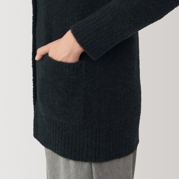 This cardigan is made with a blend of wool, giving it a soft and lightweight feel that will keep you comfortably warm all day. The loose silhouette drapes nicely on the shoulders, and it is designed with a long and comfortable length.