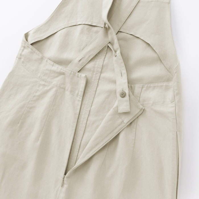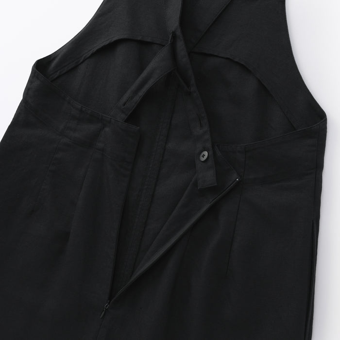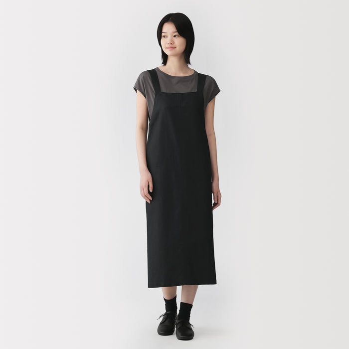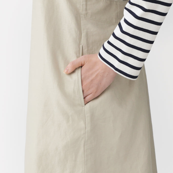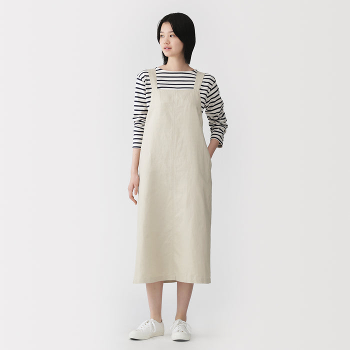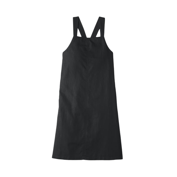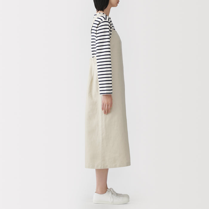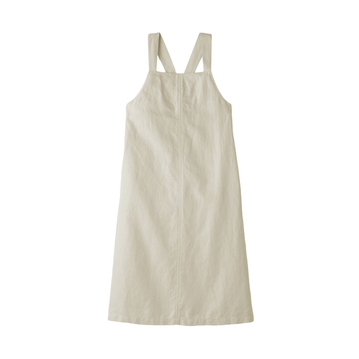 A women's jumper skirt with a boxy silhouette made with twilled hemp and organic cotton for a soft, fluffy material that's comfortable and breezy. It's long dress-like style is perfect for layering on top of a t-shirt.