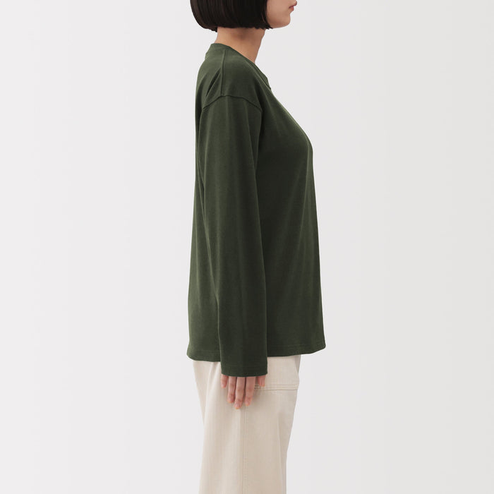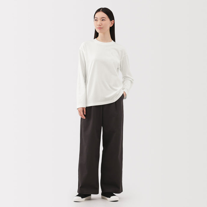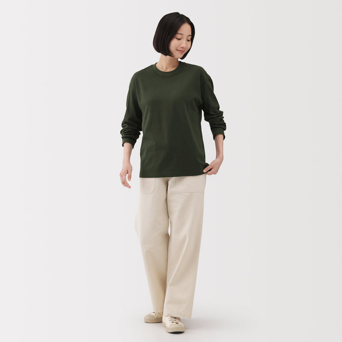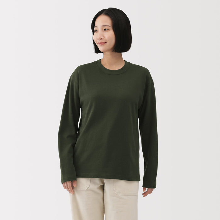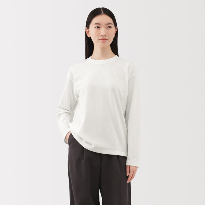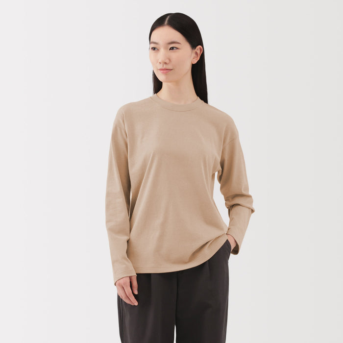 This women's long sleeve crew neck t-shirt is crafted by knitting two yarn strands together, resulting in a soft fabric with an ideal thickness for comfortable wear.