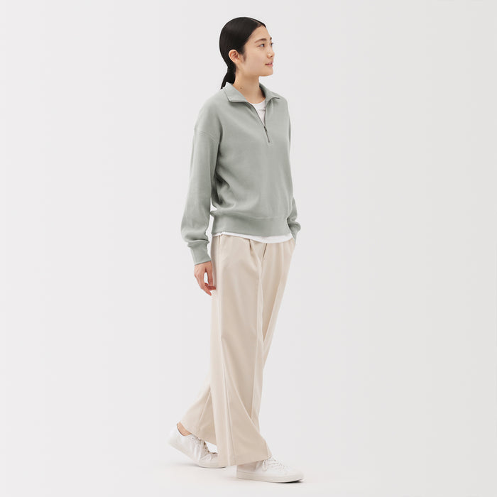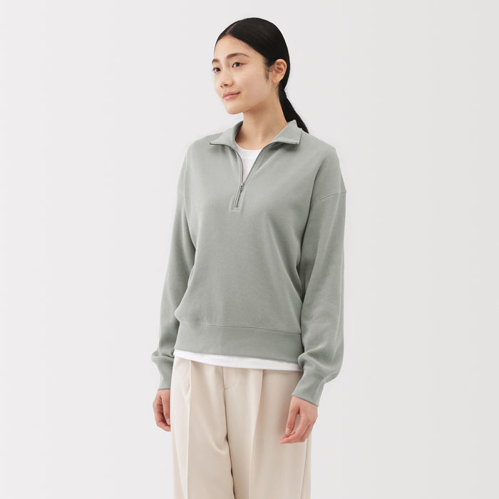 This women's half-zip pullover is comfy and lightweight, made from a soft blend of organic cotton and polyester with a cozy waffle texture.