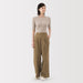 Wide chino pants with front darts, made with 100% organic cotton with uneven textured slub yarn for a soft feeling on the skin. The relaxed fit silhouette is elegant and feminine, and the darts add a three-dimensional effect to the front of the pants.