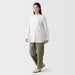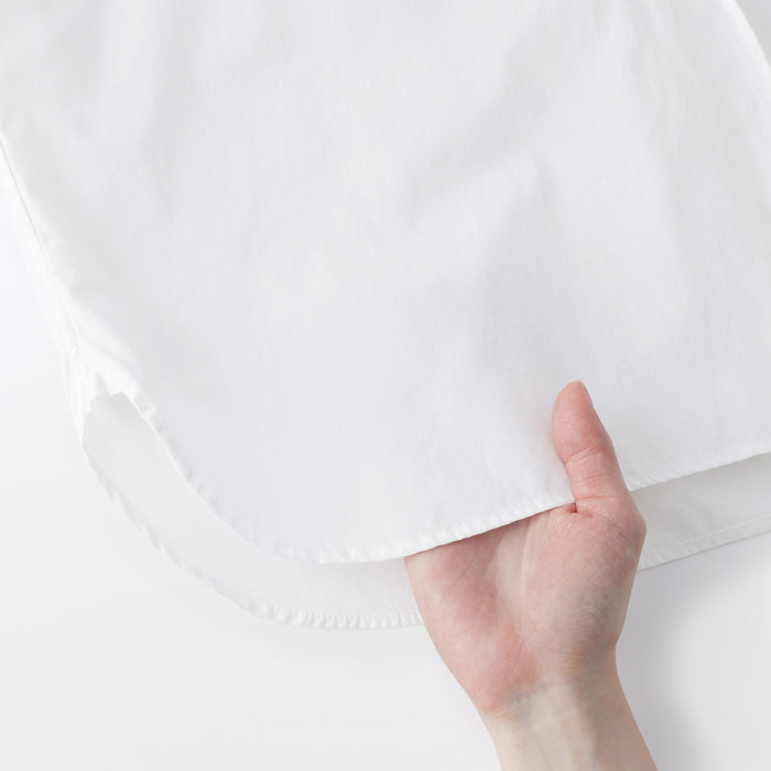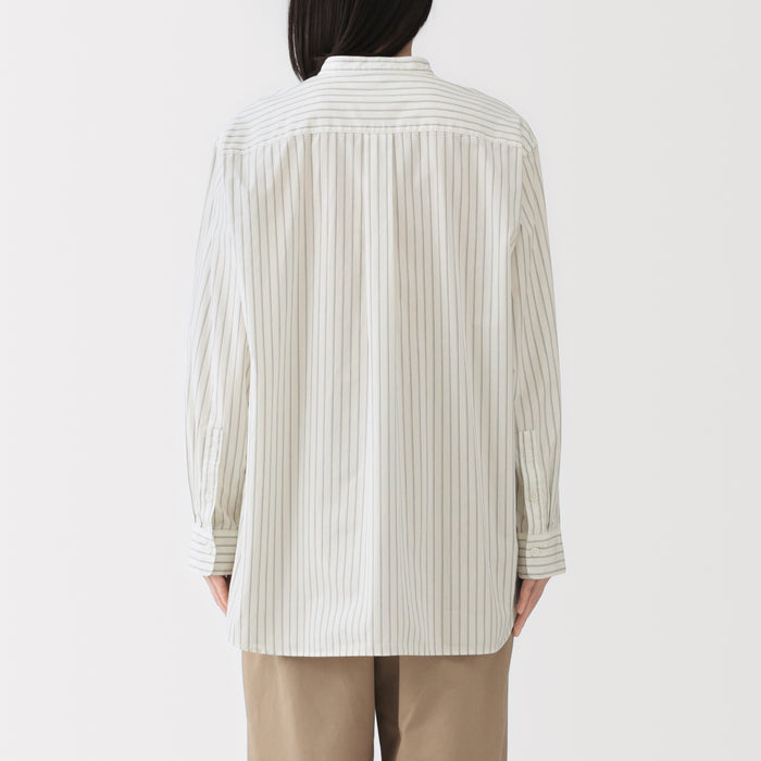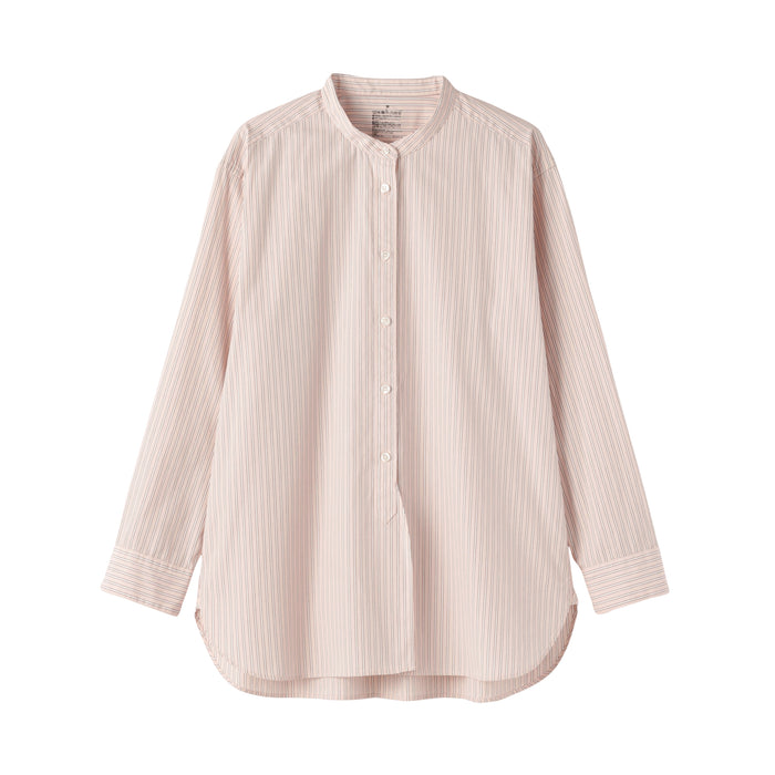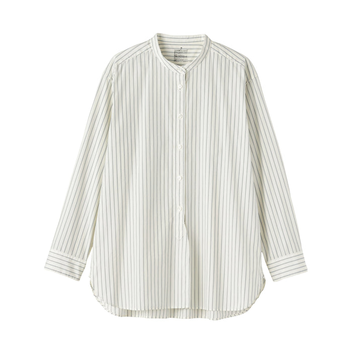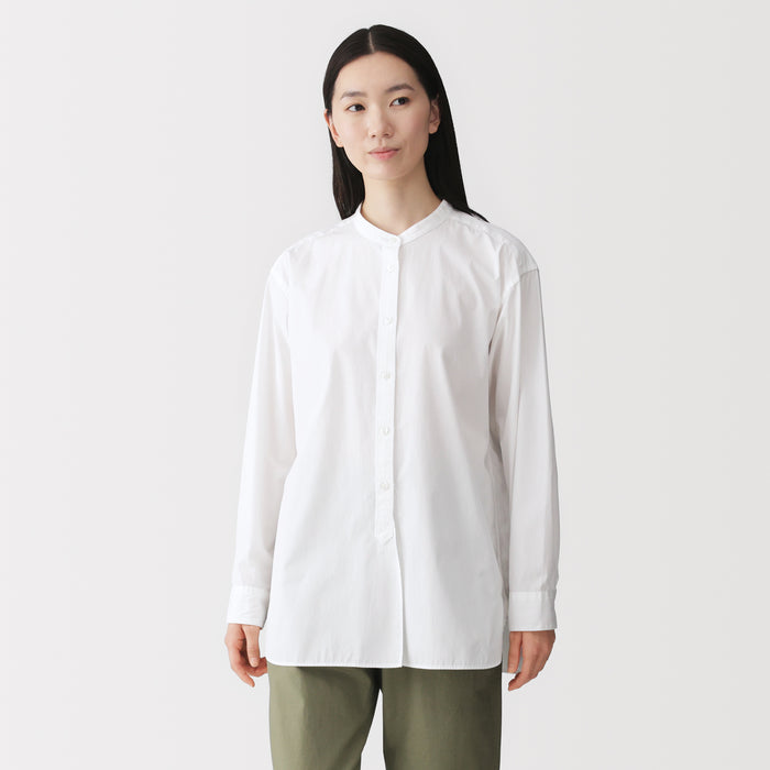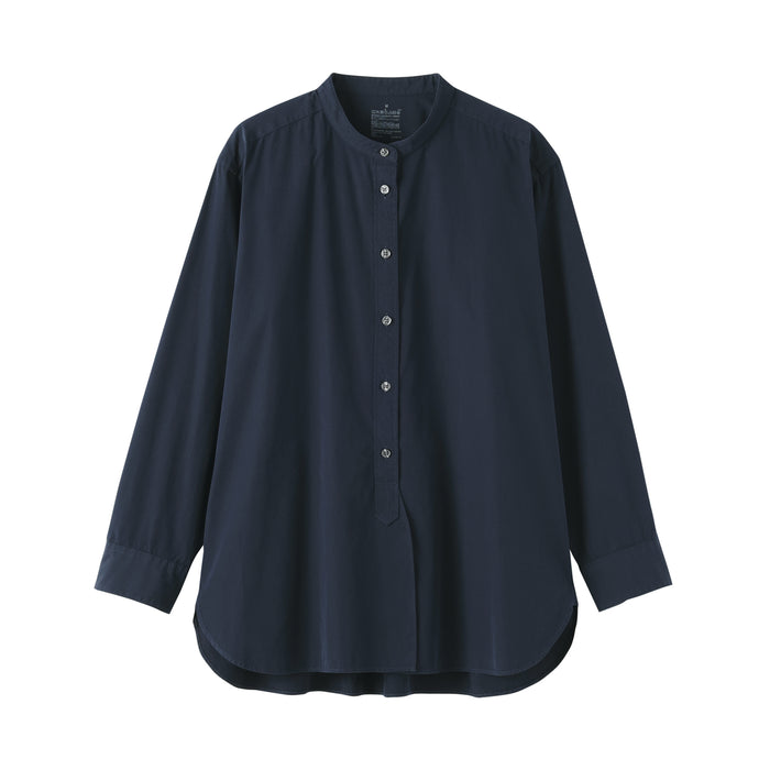 Made from organic cotton fabric that has a gentle brushed texture and pre-washed for a cozy and comfortable feel. Our women's broadcloth shirt boasts a versatile design for any occasion, with a delicate stand collar and narrow placket for a clean appearance. Its longer tunic-style length is suitable for wearing on its own or as a jacket.