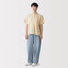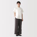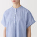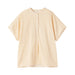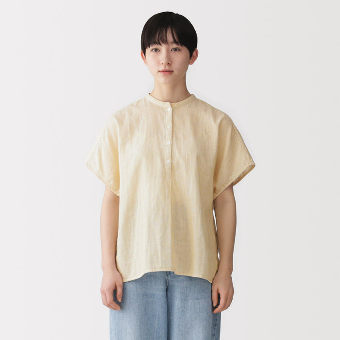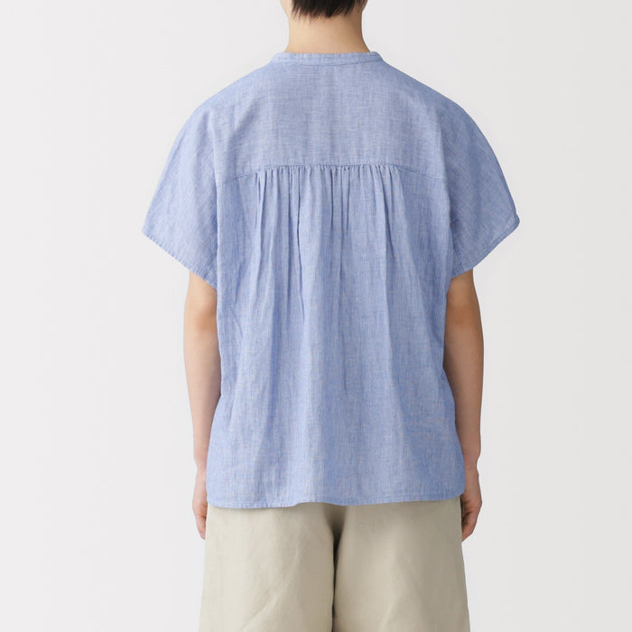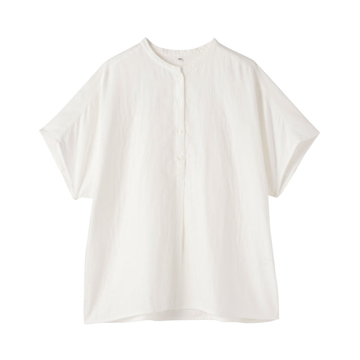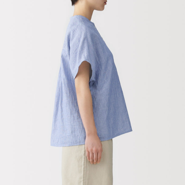 A women's short sleeve blouse with a clean stand collar and loose silhouette. The front has a clean, elegant design, while the back has gathers in the back for a softer look. Its double layered structure traps air between the gauze, making it lightweight and breathable.