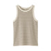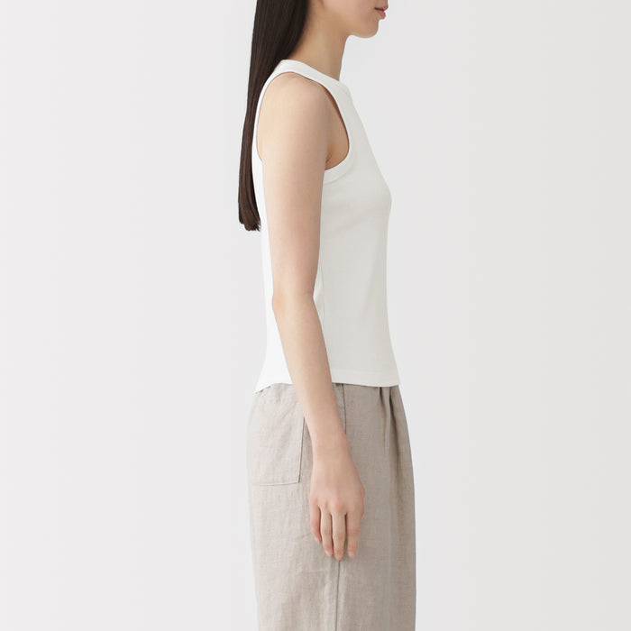 This women's tank top features a trendy American sleeve design, similar to racer-style tops. It is a sleeveless design that is popular in Japan, with a high neckline and angled armholes that accentuate the shoulders, giving off a sporty impression.