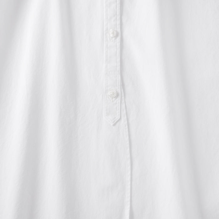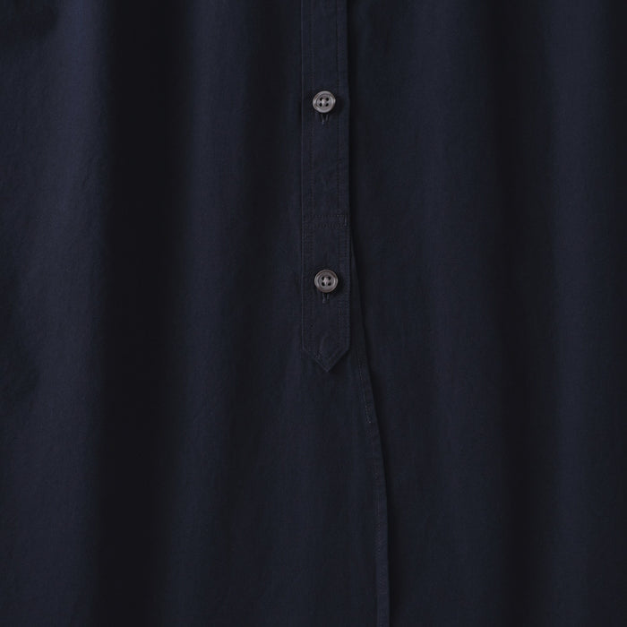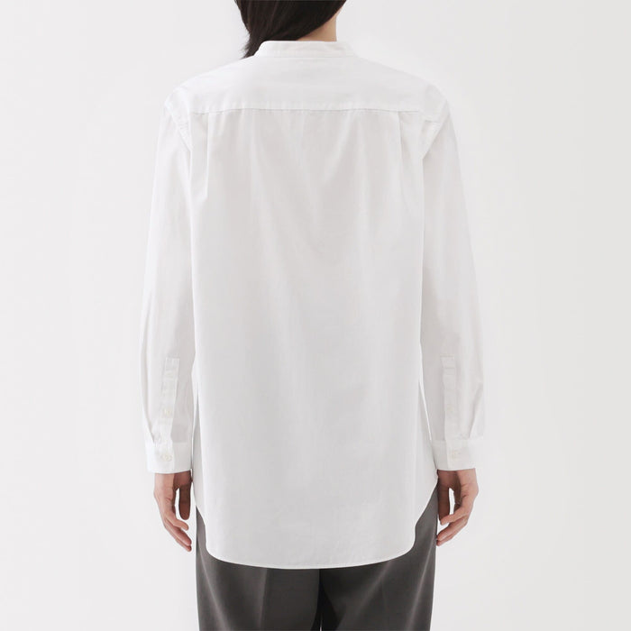 The fabric is lightly brushed and pre-washed for a soft and comfortable feel. This shirt has a clean and versatile design, with a delicate stand collar and a longer length than regular shirts. Made with organic cotton.