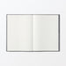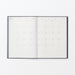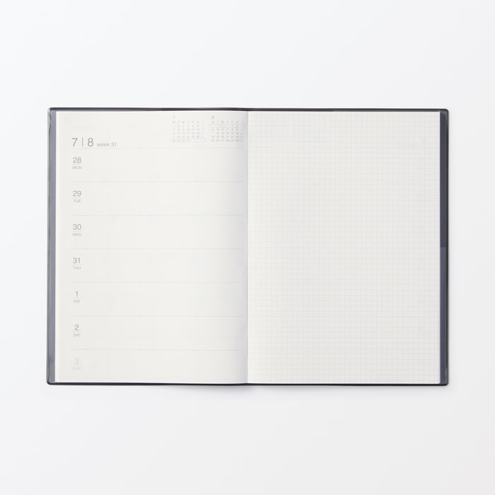 - Weekly horizontal pages on left pages, with blank grid page on right pages