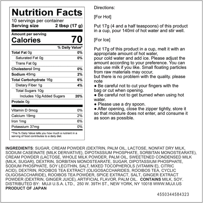 Instant chai, with combined flavors of ginger and rooibos. It has a rich, milky feeling with a refreshing aftertaste.