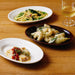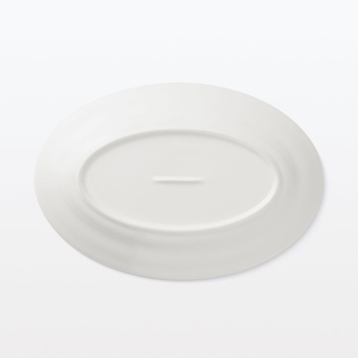 A sturdy and stable porcelain serving plate based on commercial tableware, with an oval shape that takes up less space on the dinner table. The rimmed edge is practical, making it easy to hold and preventing your dishes from spilling.