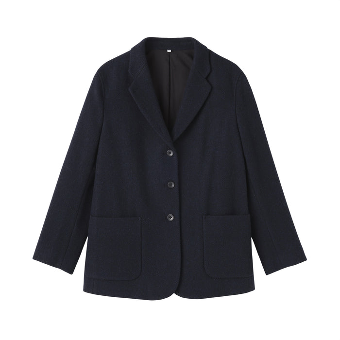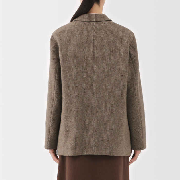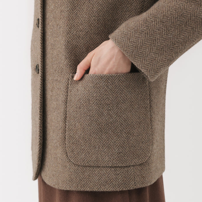 Soft, cozy, and made with fluffy, eco-friendly wool - this tailored jacket is a stylish and sustainable addition to your wardrobe to keep you warm this season. With a traditional herringbone pattern, it is simple and classy enough to wear both on and off the job. When the first button is fastened, the collar stands up to cover your neck from the cold.