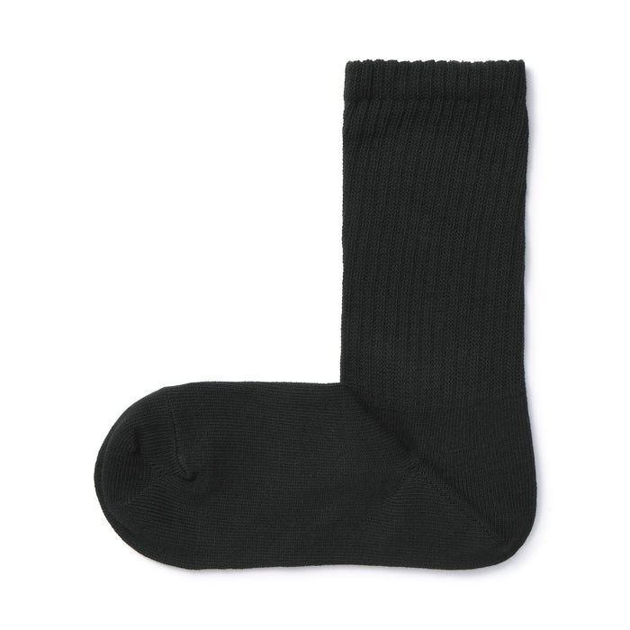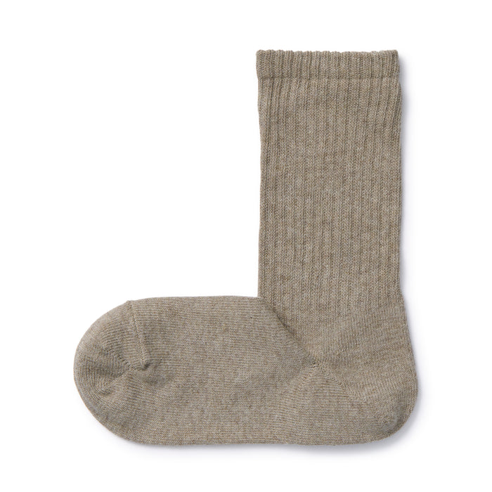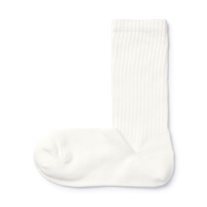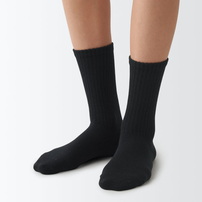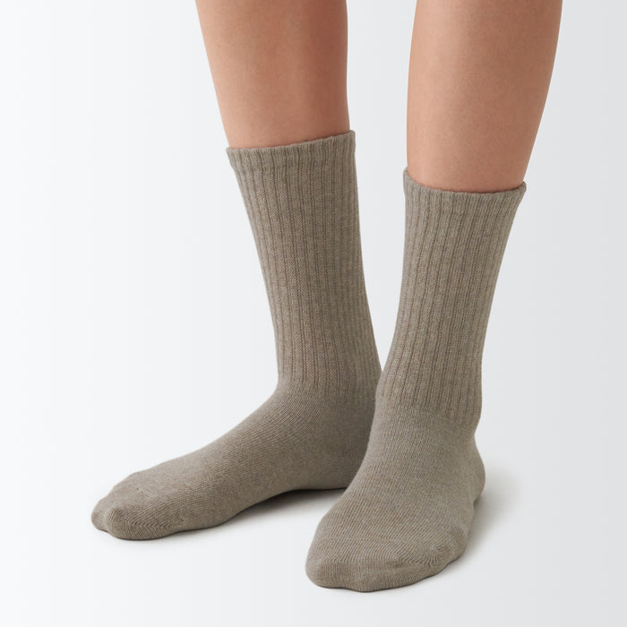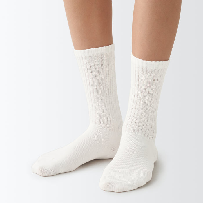 As the heel is at a right angle, the socks are knitted at the right angle to wrap comfortably around the heel and prevent fabric from sagging and slipping off. Cotton yarn for inside and stretchy one in the middle. Made using organic cotton. Loose fit can be pulled up or worn down.
