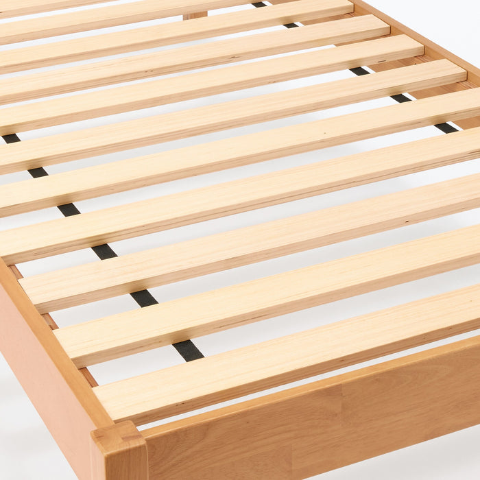 This rubberwood wooden bed frame is designed for easy assembly and leaves plenty of space underneath for storage. Storage boxes in photos not included. The rubberwood veneer adds a touch of nature to your room.